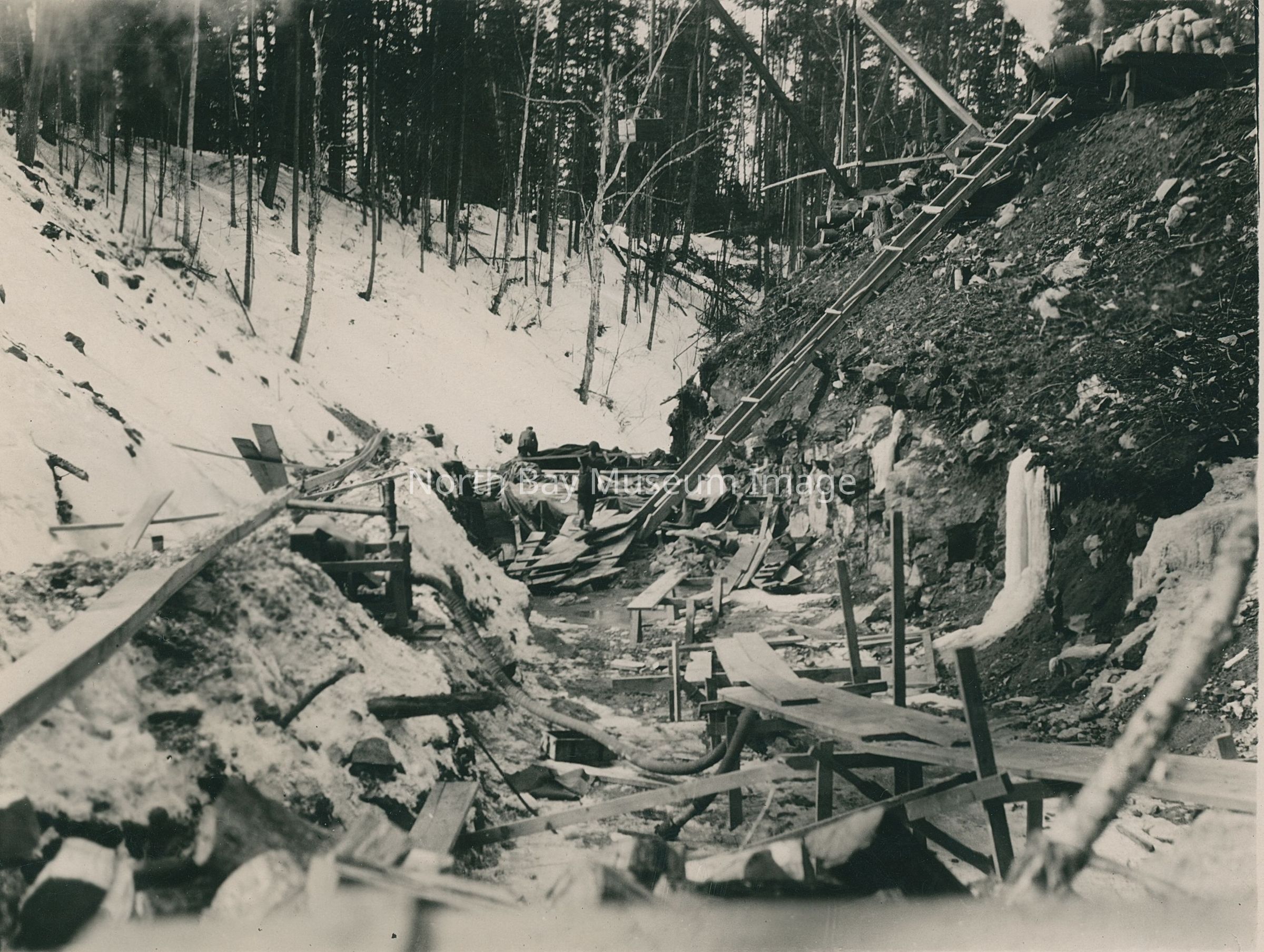 Print, Photographic - black and white photograph - shows a snow-covered gully/creekbed - ladder reaching down hillside with boards forming a path alongside the creekbed