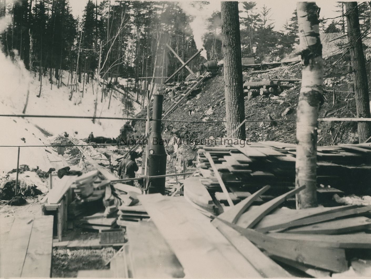 Print, Photographic - black and white photograph - shows a stack of lumber outdoors - large funnel-shaped metal machine is also shown, producing steam