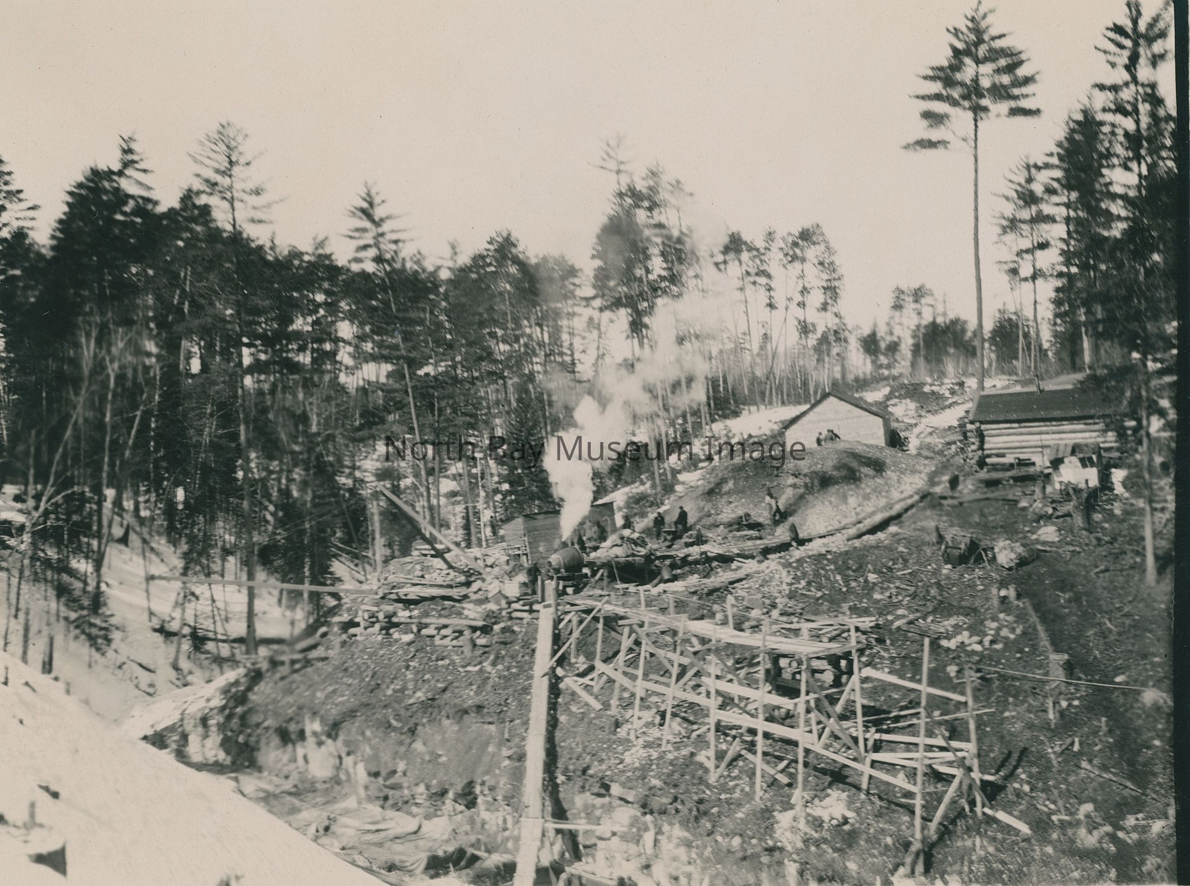 Print, Photographic - black and white photograph - shows tracks being constructed along a gully