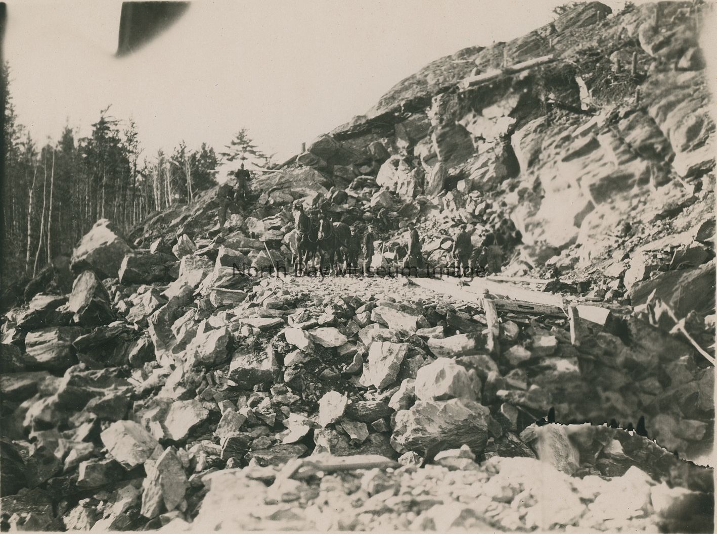 Print, Photographic - black and white photograph - shows a rocky hillside with two harnessed horses, several men in workclothes complete the scene