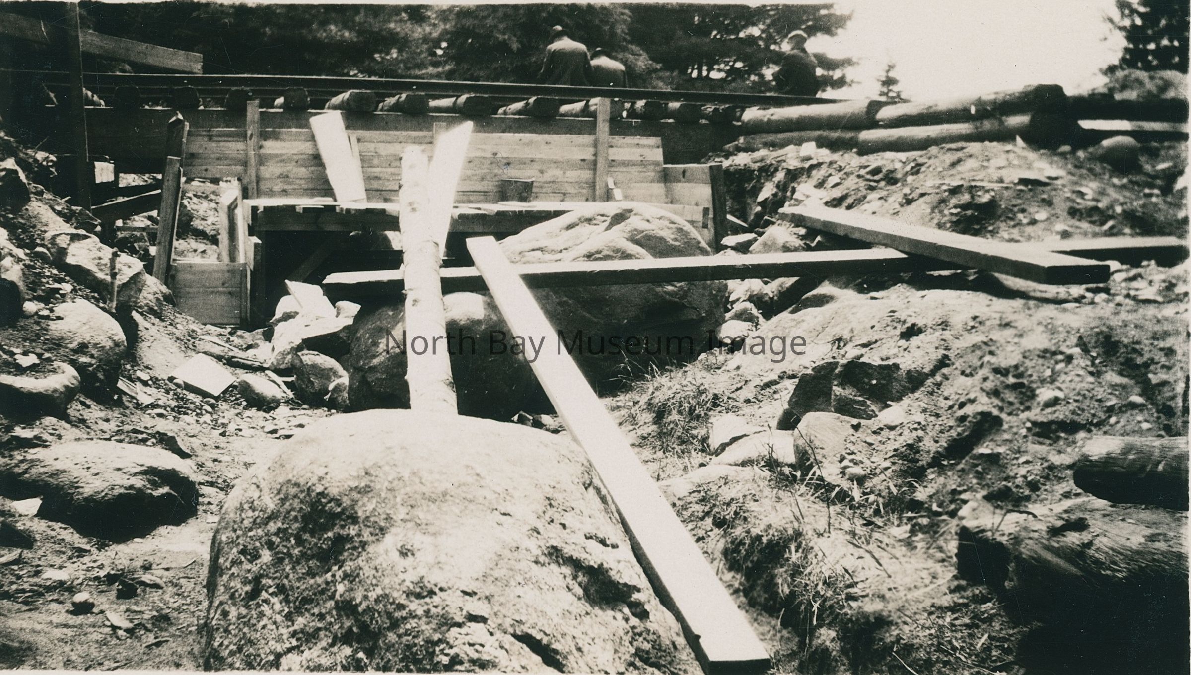 Print, Photographic - black and white photograph - shows side-view of railway track with wooden structure beneath - large rocks and lumber in the foreground