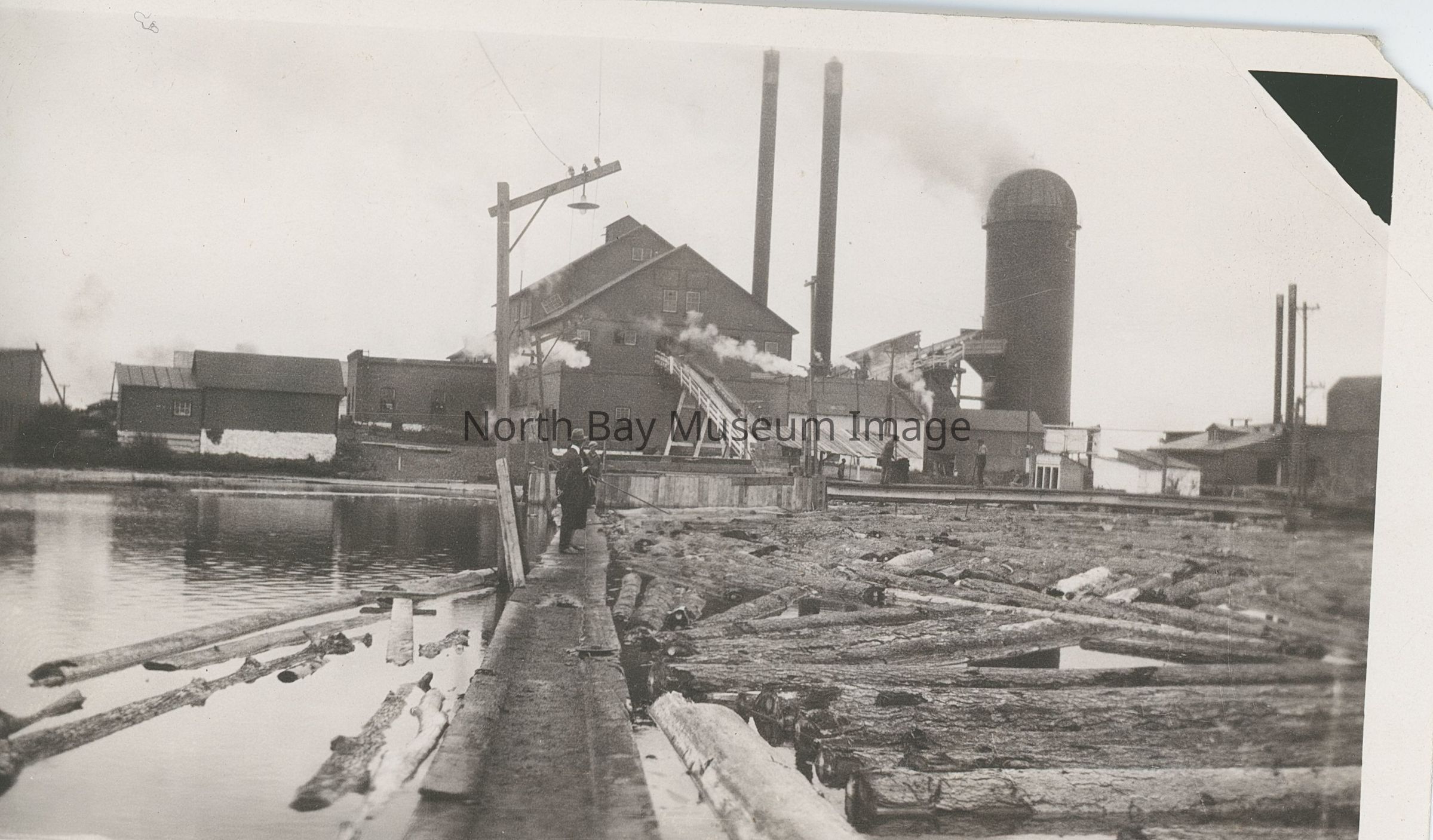 Print, Photographic - black and white photograph - shows George Gordon Co. Saw Mill in Cache Bay - photograph taken from the water - floating logs in foreground with men standing on platform in water