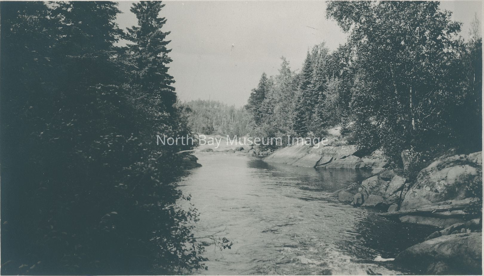 Print, Photographic - black and white photograph - shows a river with trees and rocks surrounding it - stamped on back in purple ink 'Velotone Kodak Prints Made by Strain's Ltd. Winnipeg'