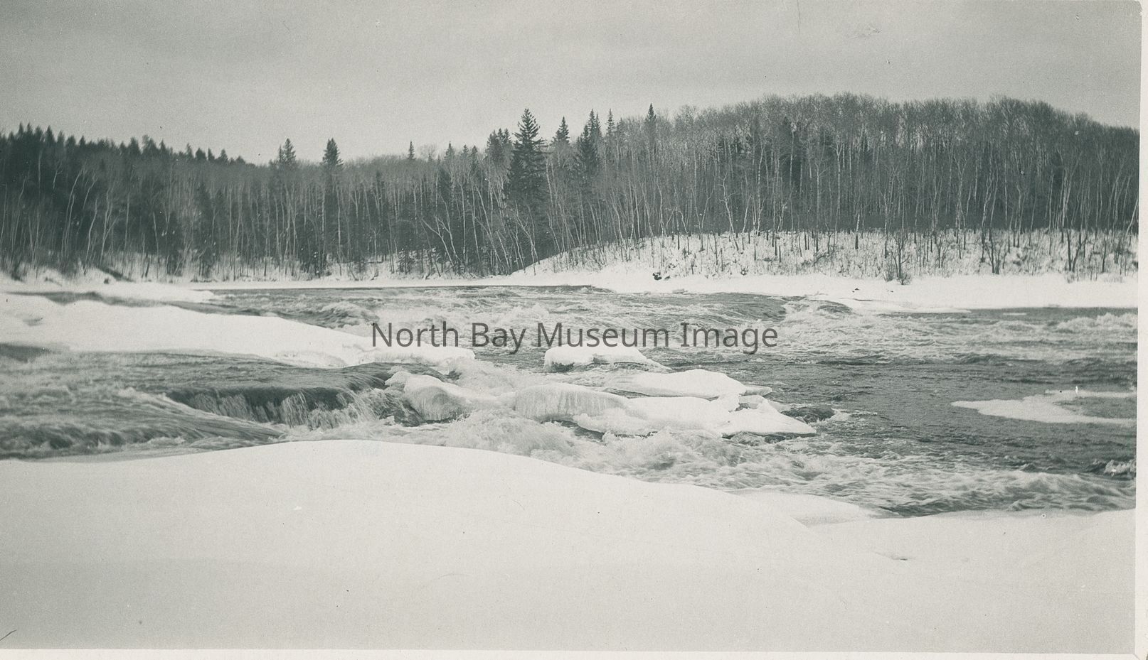 Print, Photographic - black and white photograph with glossy finish - shows white water rapids in winter - trees in background
