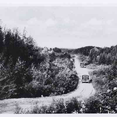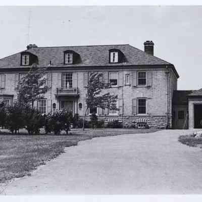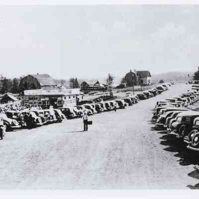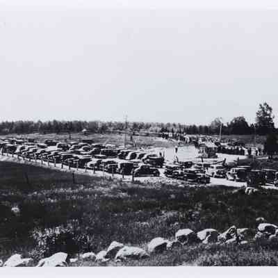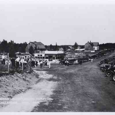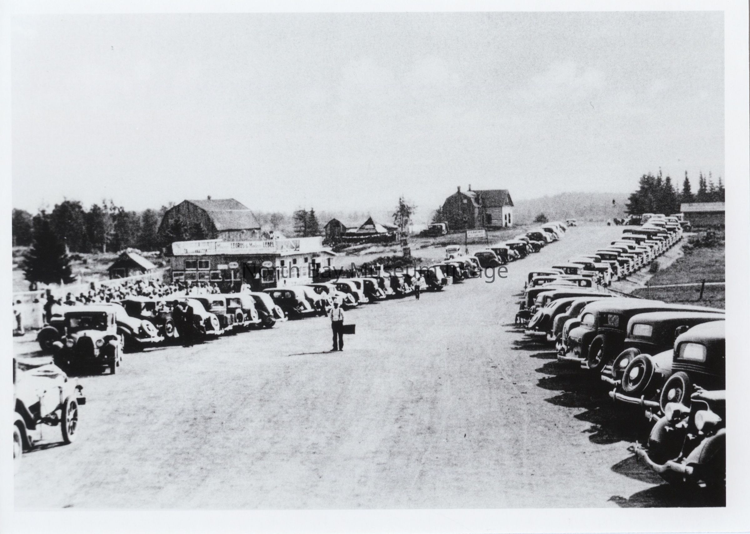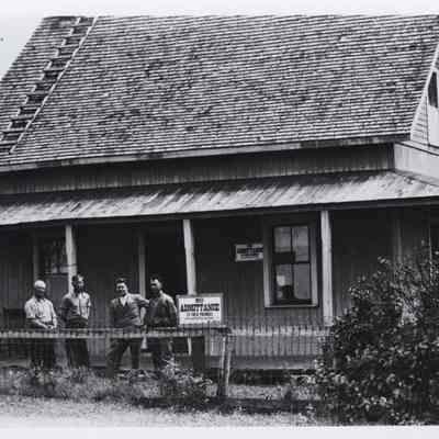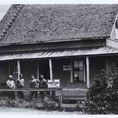 023.20.22b: 4 men in front of Dionne Quintuplets house with "No Admittance" sign.