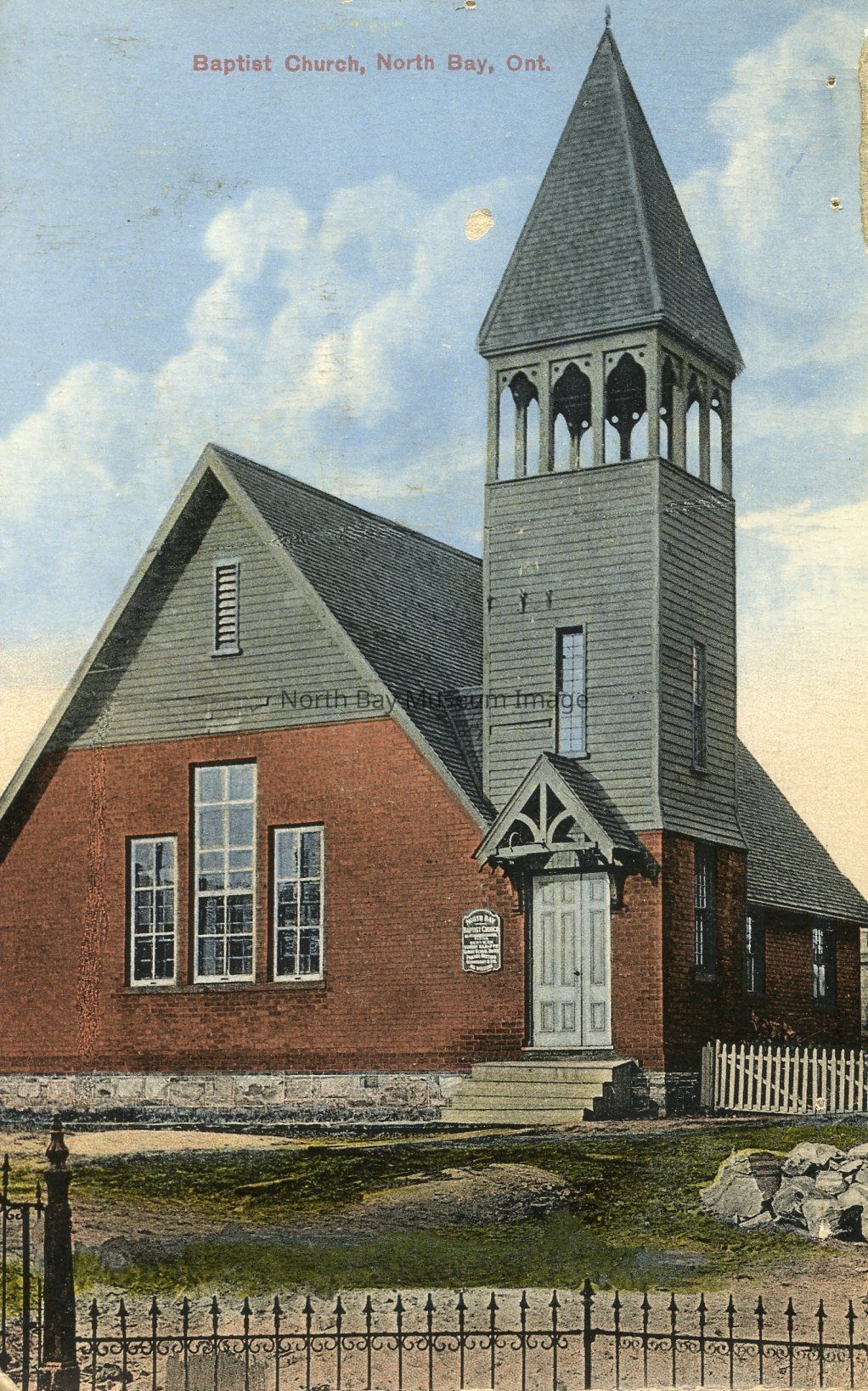 This is a coloured postcard of the Baptist Church in North Bay. The building is a red brick with green accents. The bell tower is green and is prominent on the right side of the building. There is a few small windows on the building. The entrance is a small white door.Creator