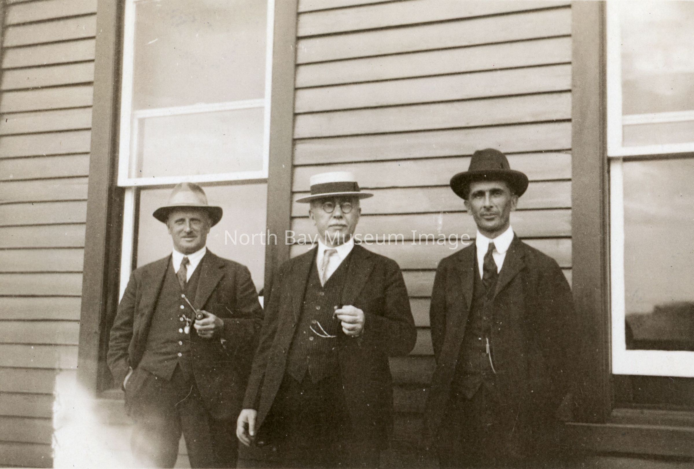 Photograph - 3 men posing in front of building. - Senator George Gordon (centre) is wearing a boater (hat) and pocketwatch, also holding cigar - Bover Bain on left - taken in Cache Bay