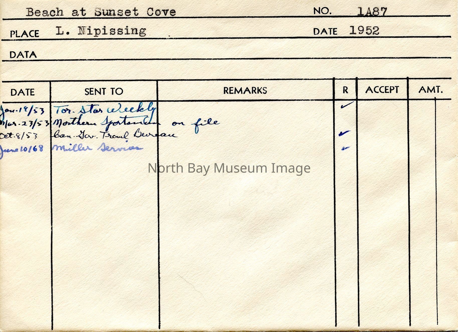 Envelope (a) containing photo and negative (b-c) of Beach at Sunset Cove. Forder's original number was 1A87. Envelope has places published listed on front. Date is listed as 1952.Creator