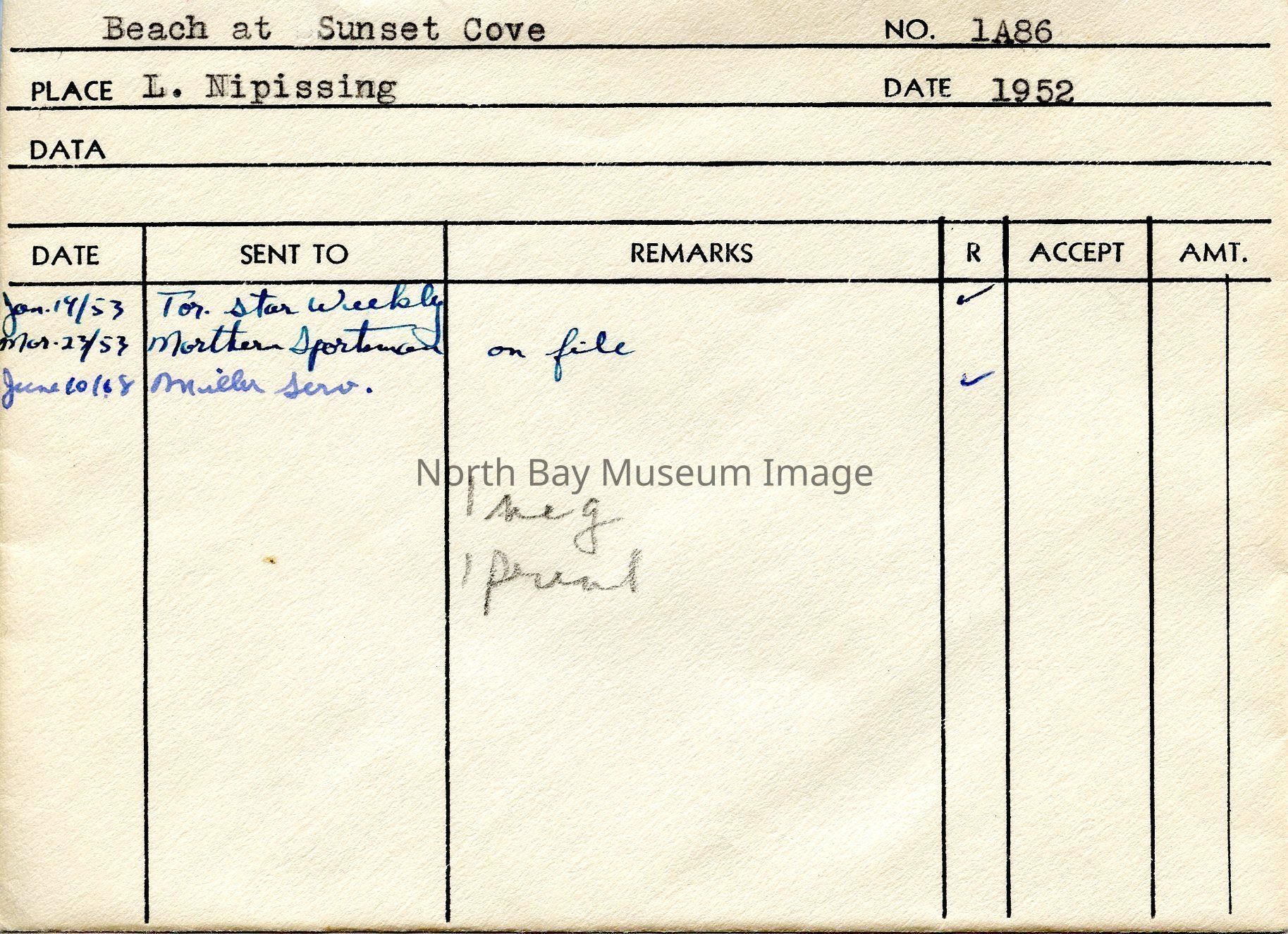 Envelope (a) containing photo and negative (b-c) of Beach at Sunset Cove. Forder's original number was 1A86. Envelope has places published listed on front. Date is listed as 1952.Creator