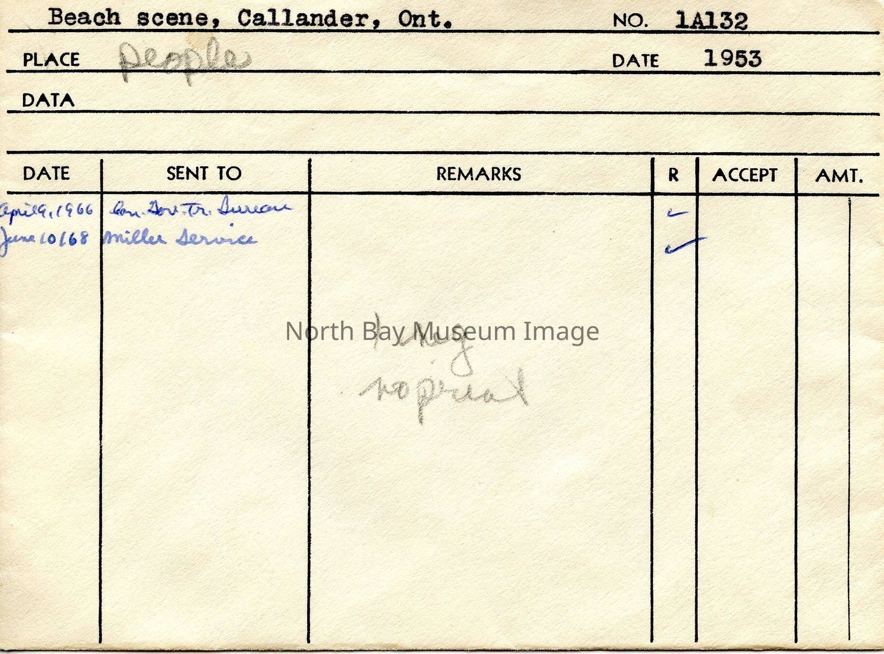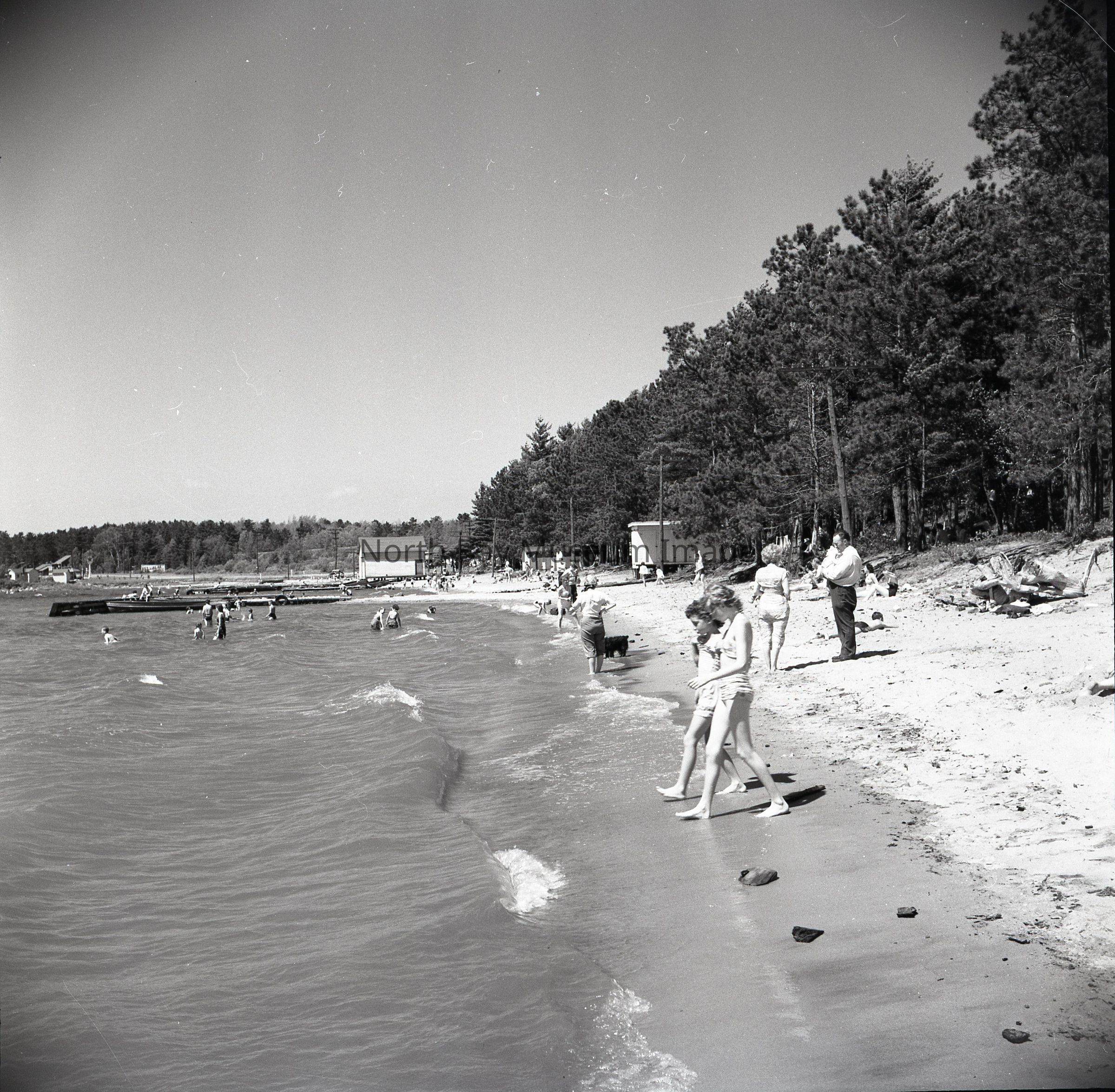 Photographer's Envelope (a) contains photographs and negatives (b-c) of a beach scene in Callander Bay. The image captures many bathers come to Callander Bay to swim in the summer. There are many people both on the beach and in the water. Publications of the photo are listed on the back of the envelope.This image is a part of the Forder Collection.Creator
