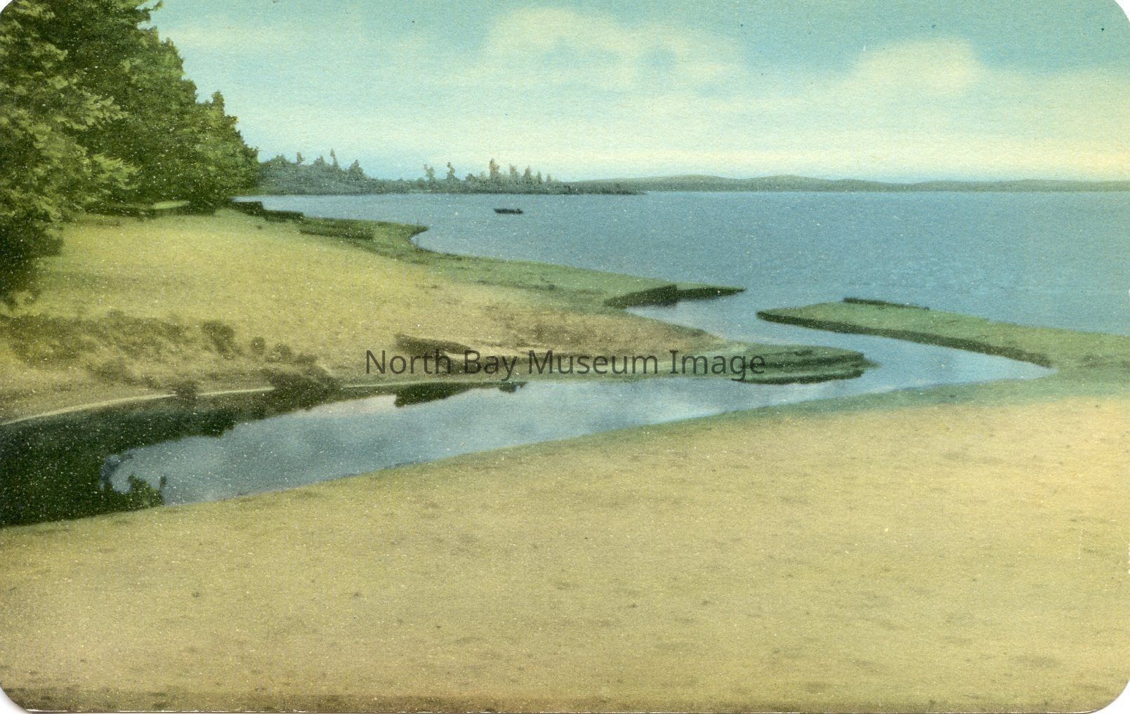 This is a coloured postcard of the Shoreline of Lake Nipissing in North Bay. The image shows the lake and shoreline. The water is cold. There is no buildings visable in the image.