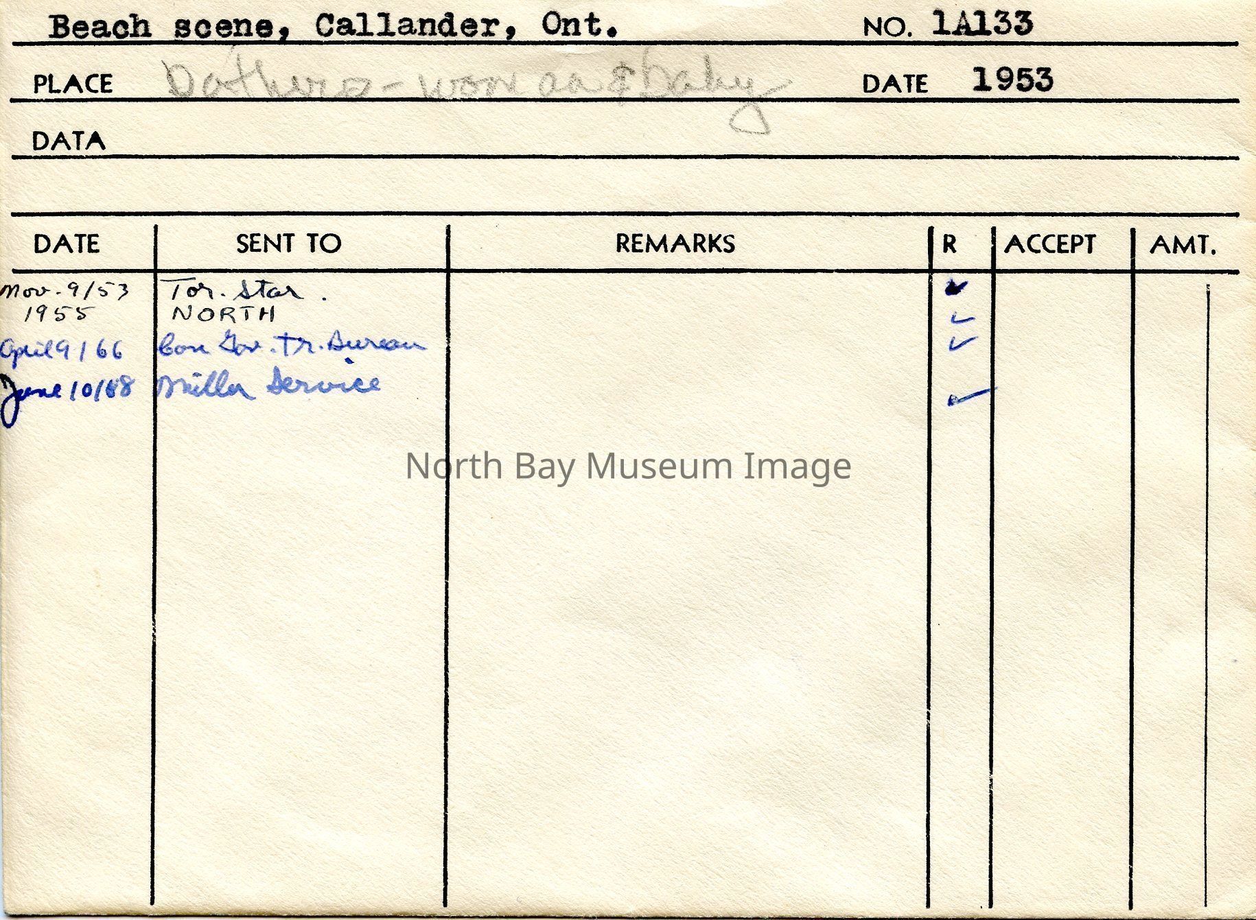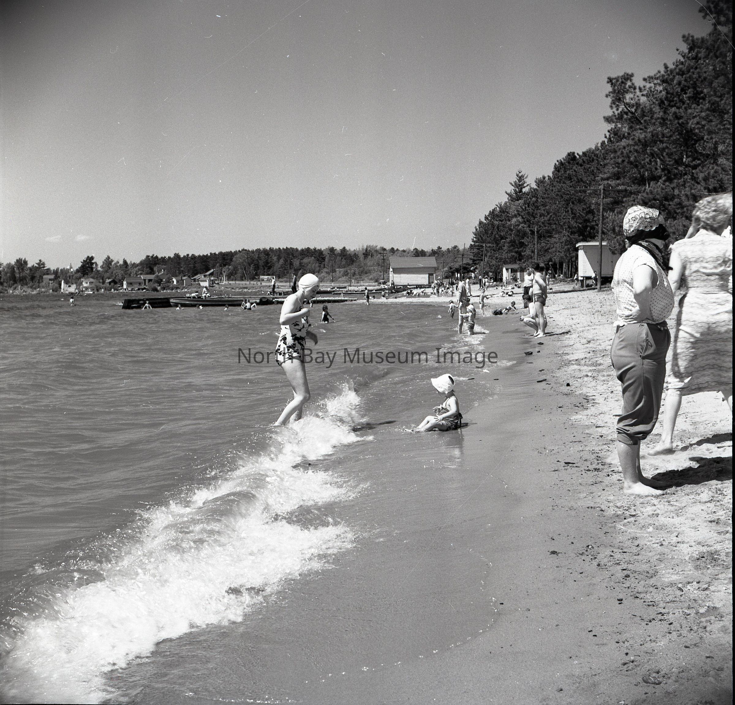 Photographer's Envelope (a) contains photographs and negatives (b-c) of a beach scene in Callander. The image captures many bathers. The photo does focus on a woman and a baby who are sun bathing in the water. Publications of the photo are listed on the back of the envelope.This image is a part of the Forder Collection.Creator