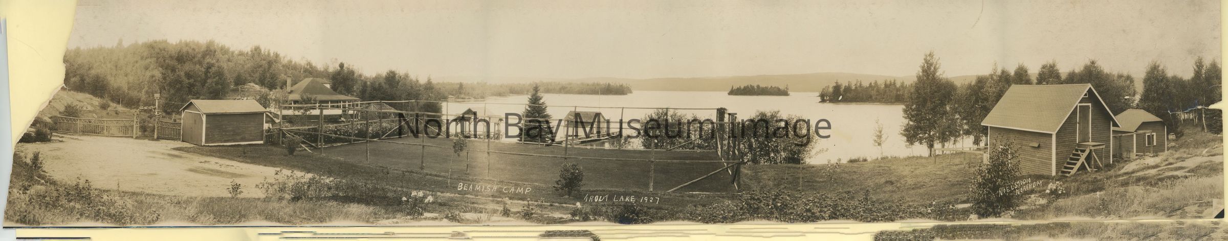 1 photograph, 8 inch x 42 inch, cottage camp owned by Arthur O'Neil, North Bay, 1910-11, ripped at the sides.
