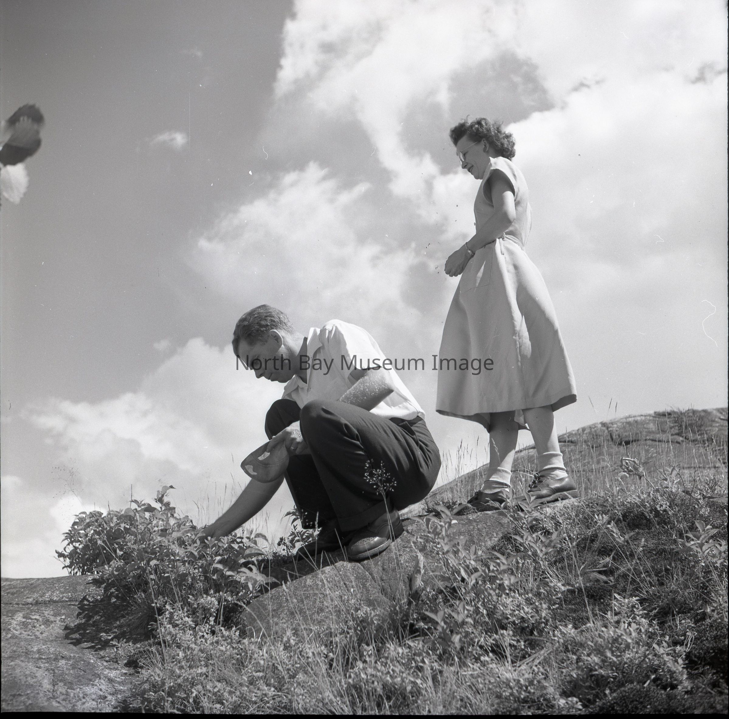 Photographer's Envelope (a) contains a negative (d) and two prints (b-c) of a photo of berry pickers. Image is by William Forder, but the location of photo is not identified. Man is picking berries on a rocky surface with a a woman standing behind him observing.Creator