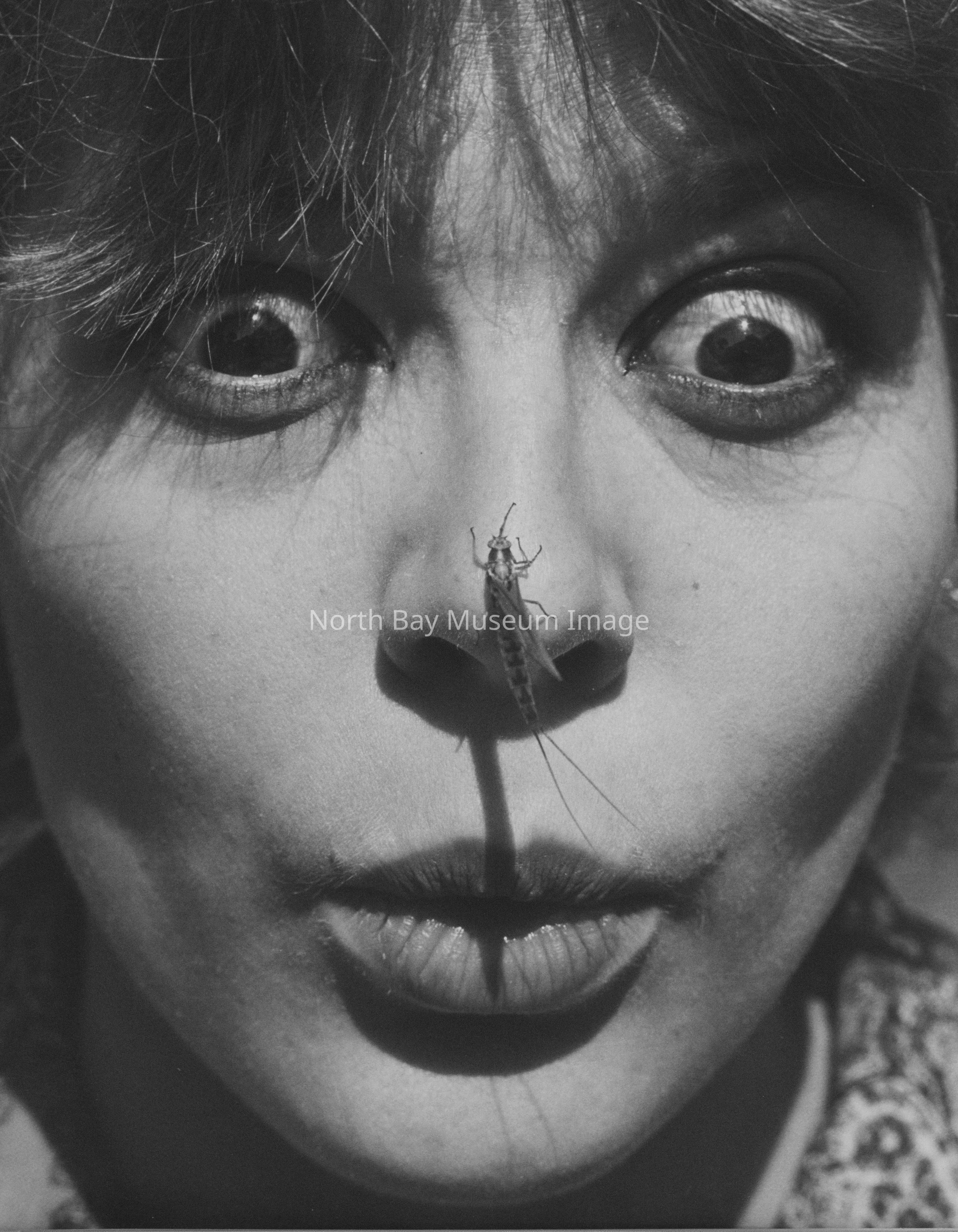 Print is a black and white photograph of a girl staring at a shadfly that has landed on the tip of her nose. Photograph by John McNeil.