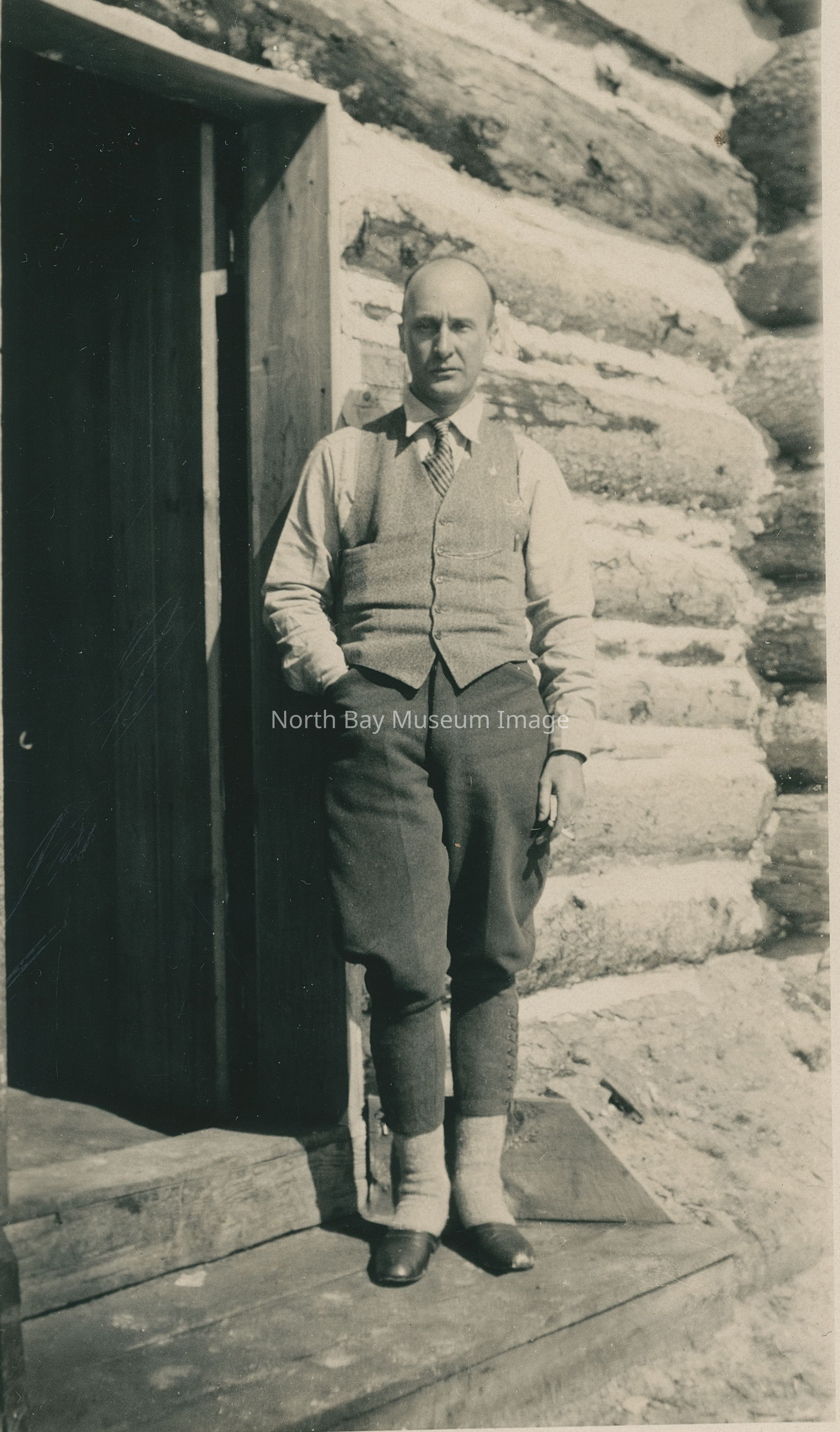 Black and white photograph that shows Bill Neal standing in the doorway of a log cabin, part of Gordon Collection.