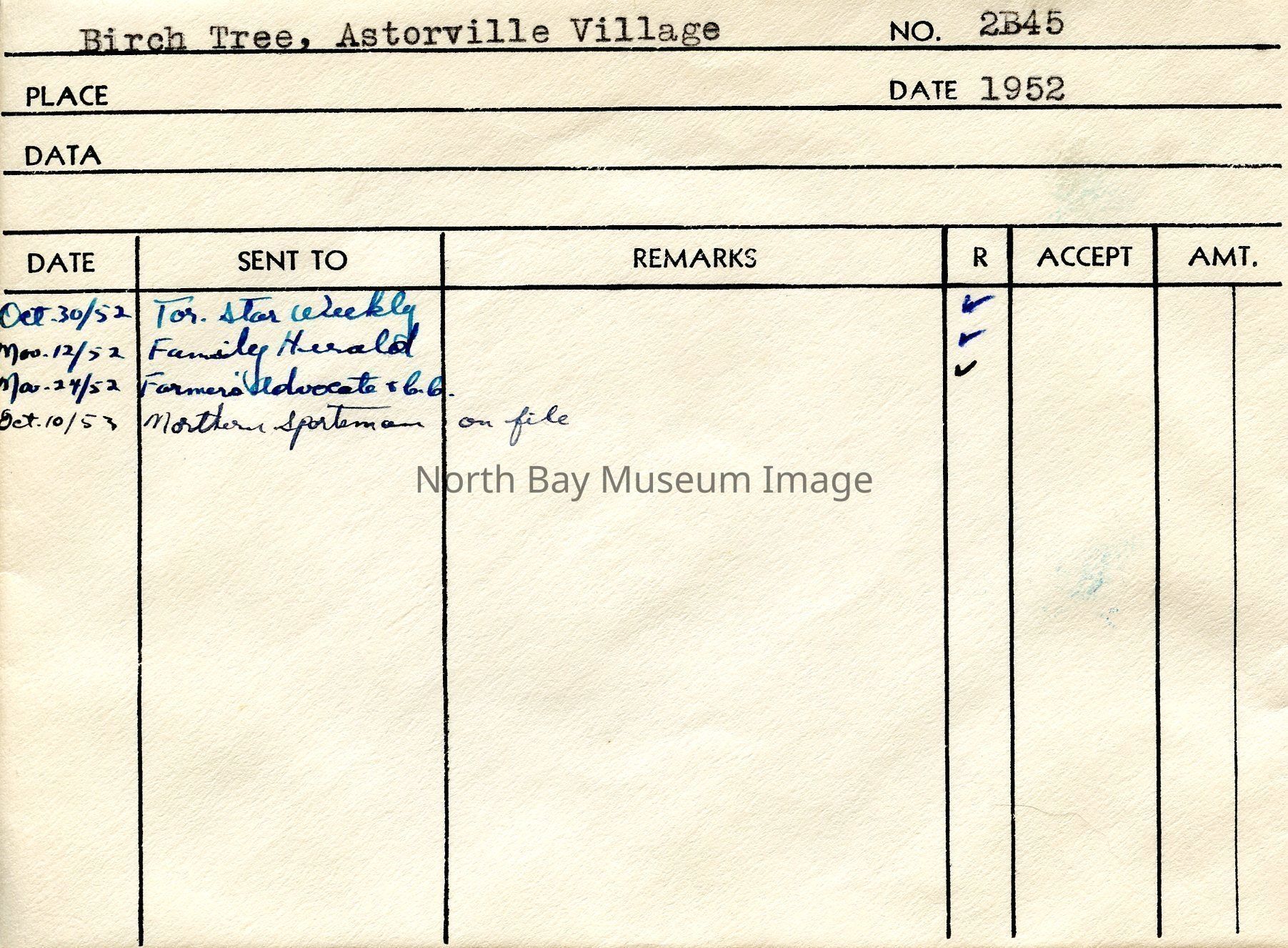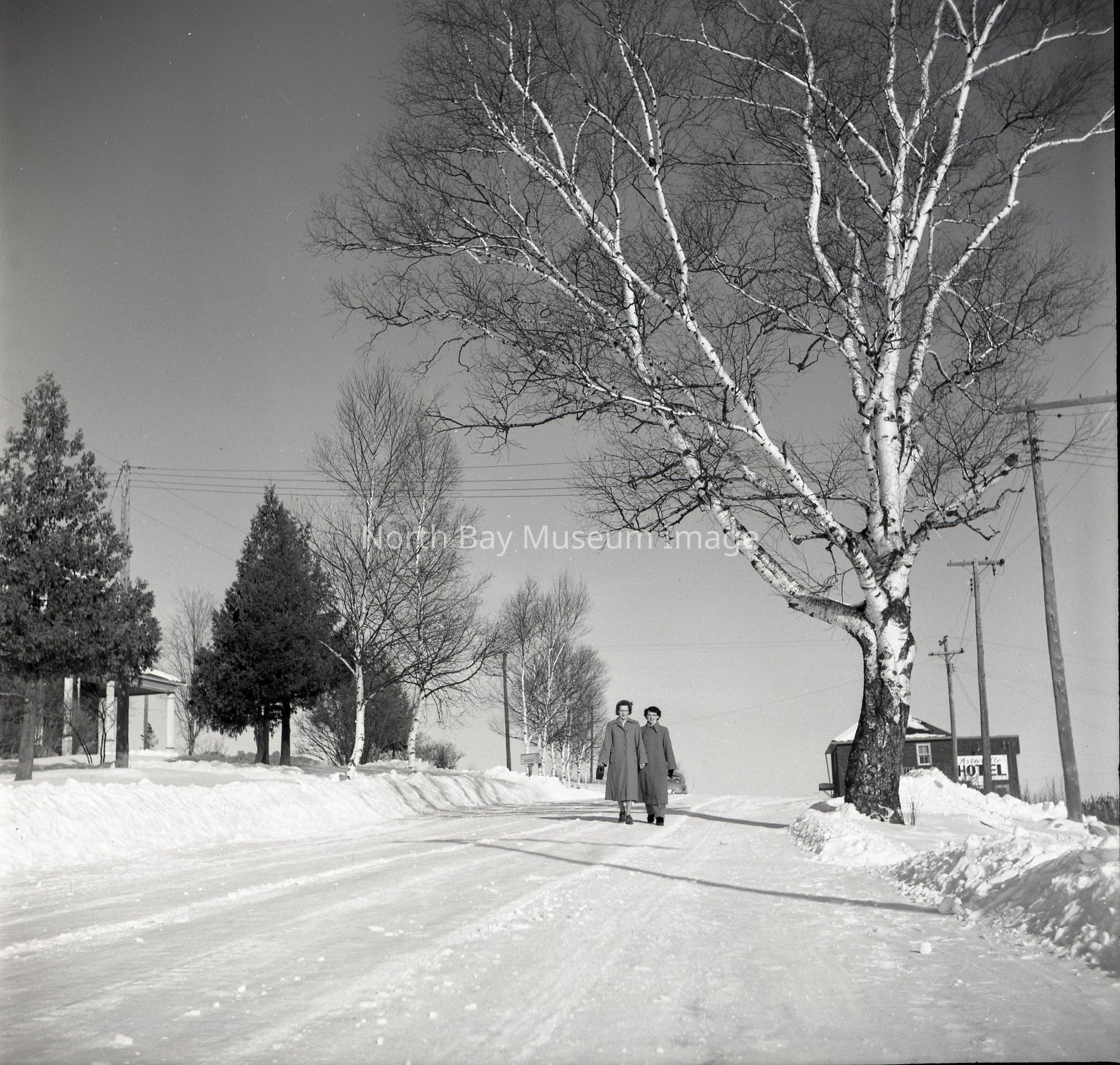 Envelope (a) containing photograph and negative (b-c) of Birch Trees at Astorville Village. The image shows a image of two individuals walking in the snow down a road. Behind the people is a beautiful birch tree. A part of the Forder Collection. The photographers original number is 2B45. All of the photographs publications are listed on the the envelope.Creator