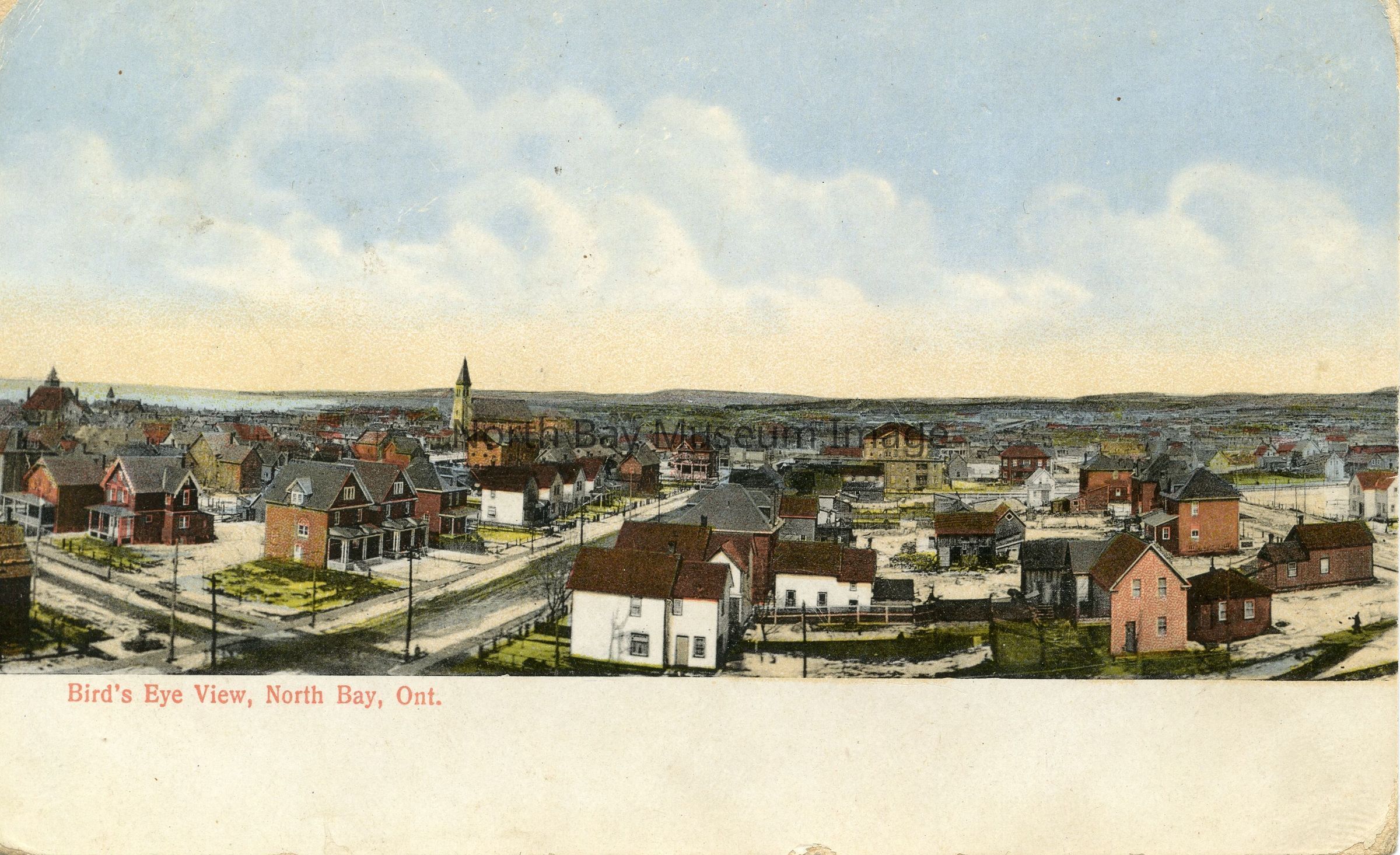 Postcard with Hand-colored photo of North Bay 1915 (similar to scene in Item 2010.2.8 which is looking north from the Normal School in 1912)