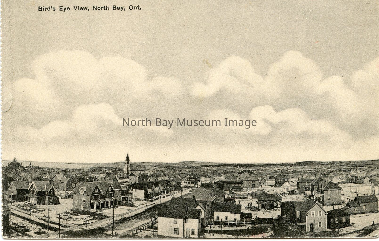 This is a black and white Postcard of a Bird' s Eye View of North Bay. This is a photo form the Early 20th Century. The photo shows the lake in the far left. There is also a church steeple that can be seen. The streets are evident.