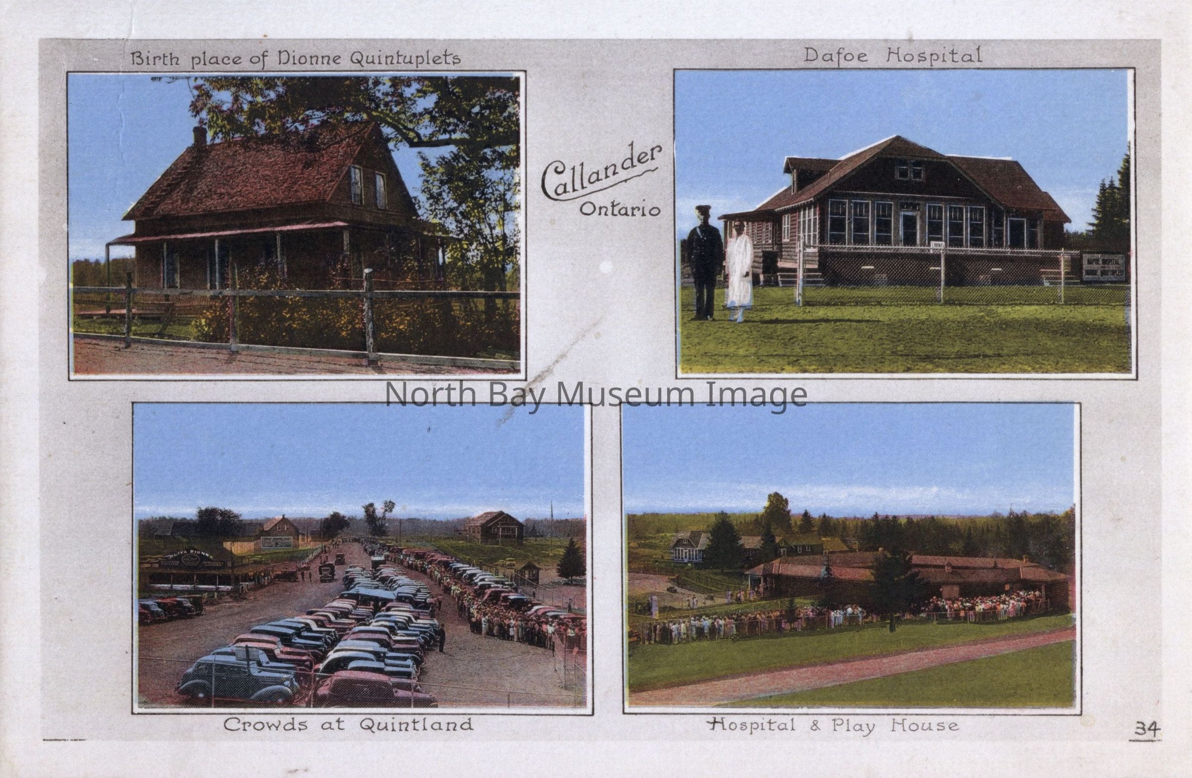 Postcard with image of Dionne birth place, Dafoe hospital, crowds at Quintland, and the Hospital and Play House