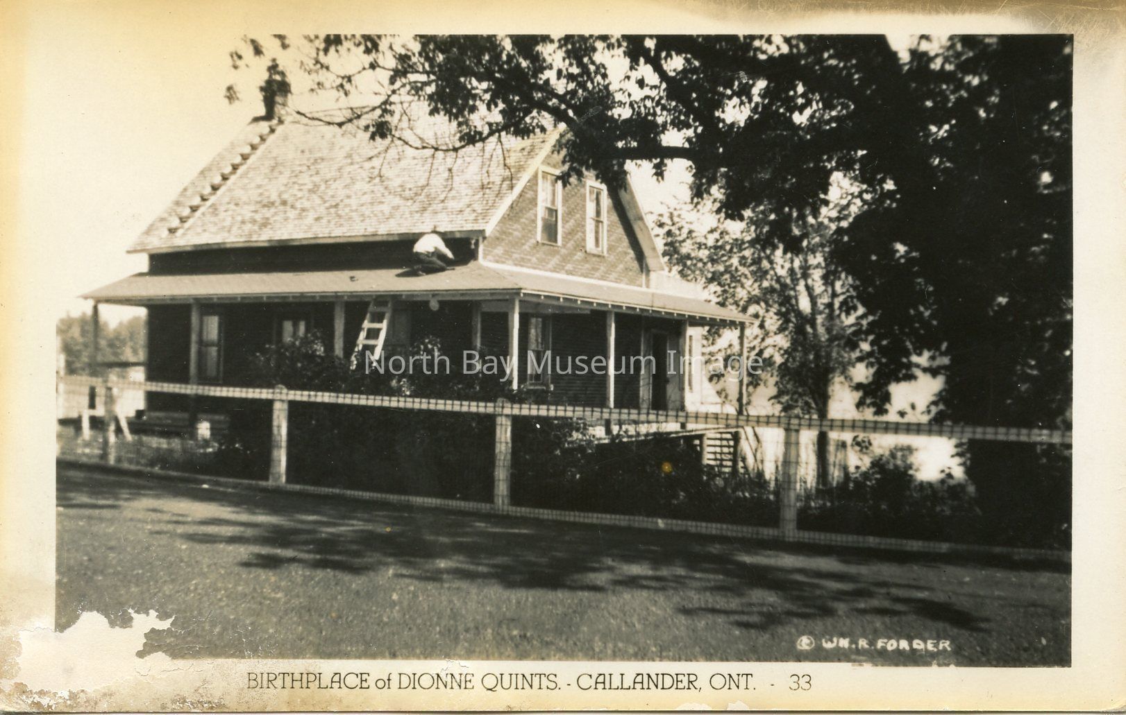 There is two postcards in this collection. Postcard A is of the birthplace of Dionne Quints. Which is located in Callander, Ont. The photo is black and white and focuses on the home of the Dionne Quints.There is a tree shading much of yard. You can see a man working on roof of house, in white shirt. You can see a white fence with chicken wire also in the foreground.