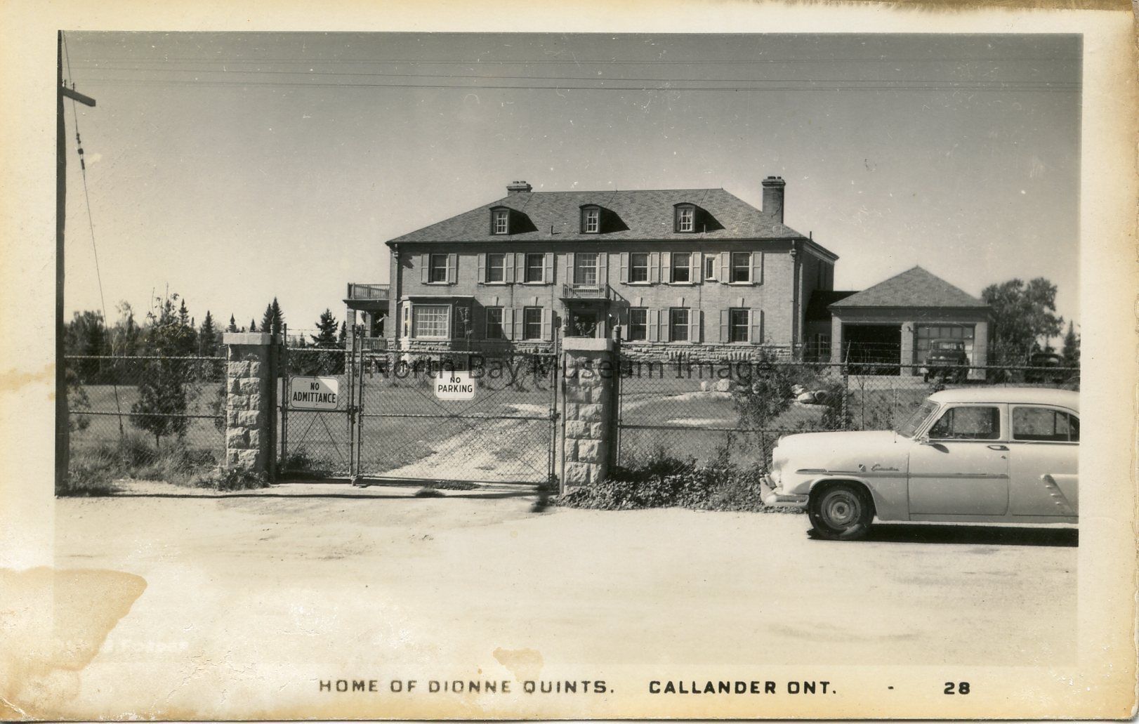 Postcard B is also of the Home of Dionne Quints in Callander. The photo is of the Big brick house, that has 3 levels. 15 of the windows can be seen. There is a light colored car on the road. There are also stone pillars with fencing on either side, and two signs on fence stating"No admittance", and "No Parking."Creator