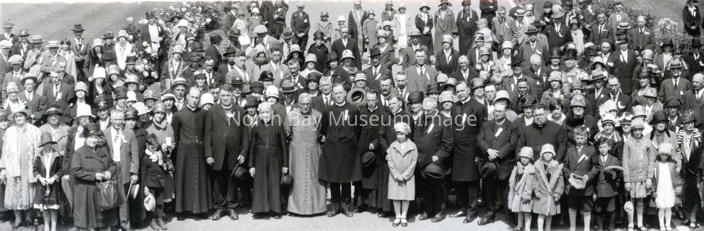 Group of clergy in front surrounded by large crowd without identifying information. Man in robe in centre of photo may be Bishop Scollard.