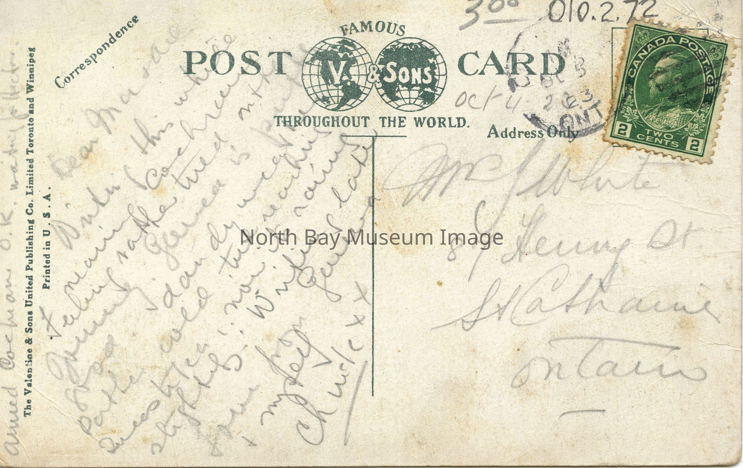 Addressee: Mrs J White, 87 Henry St., St.Catherine's, Ontario