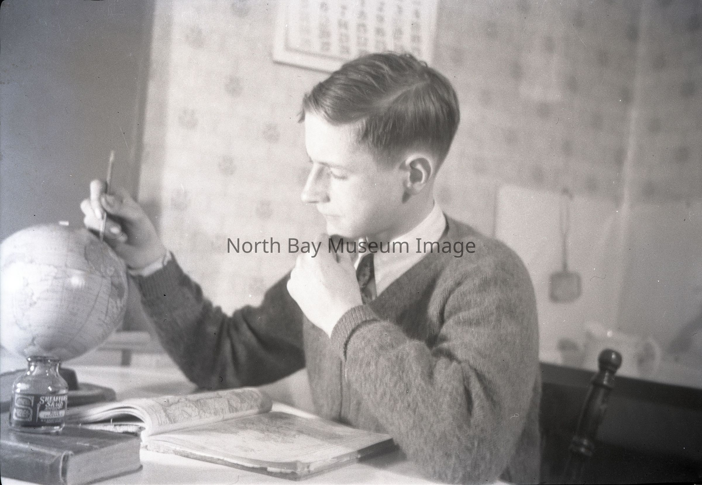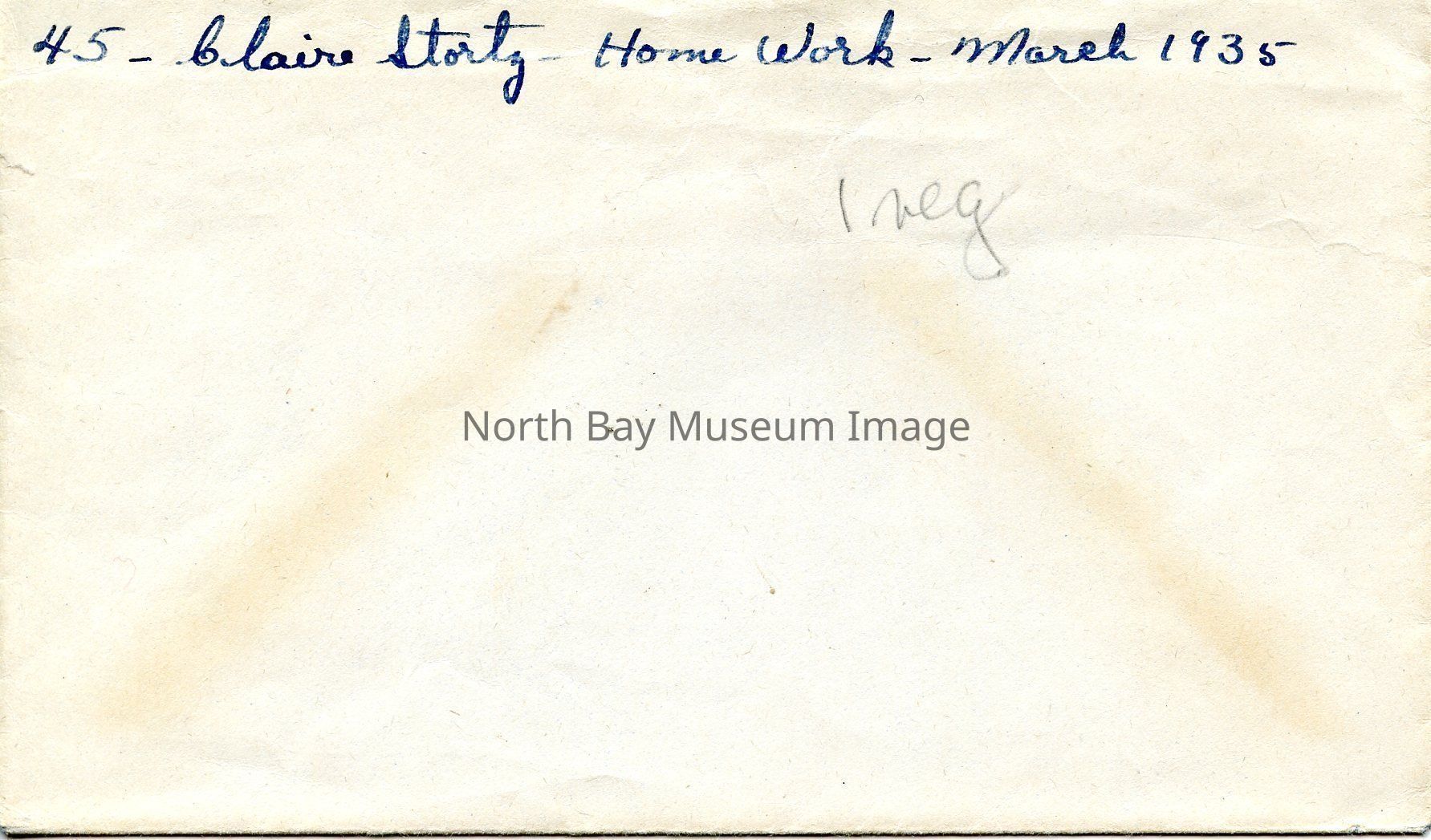 Photographer's Envelope (a) contains the photograph (b) of Blaire Storty doing homework. The image shows a person working on homework. Publications of the photo are listed on the back of the envelope. A part of the Forder Collection.Creator
