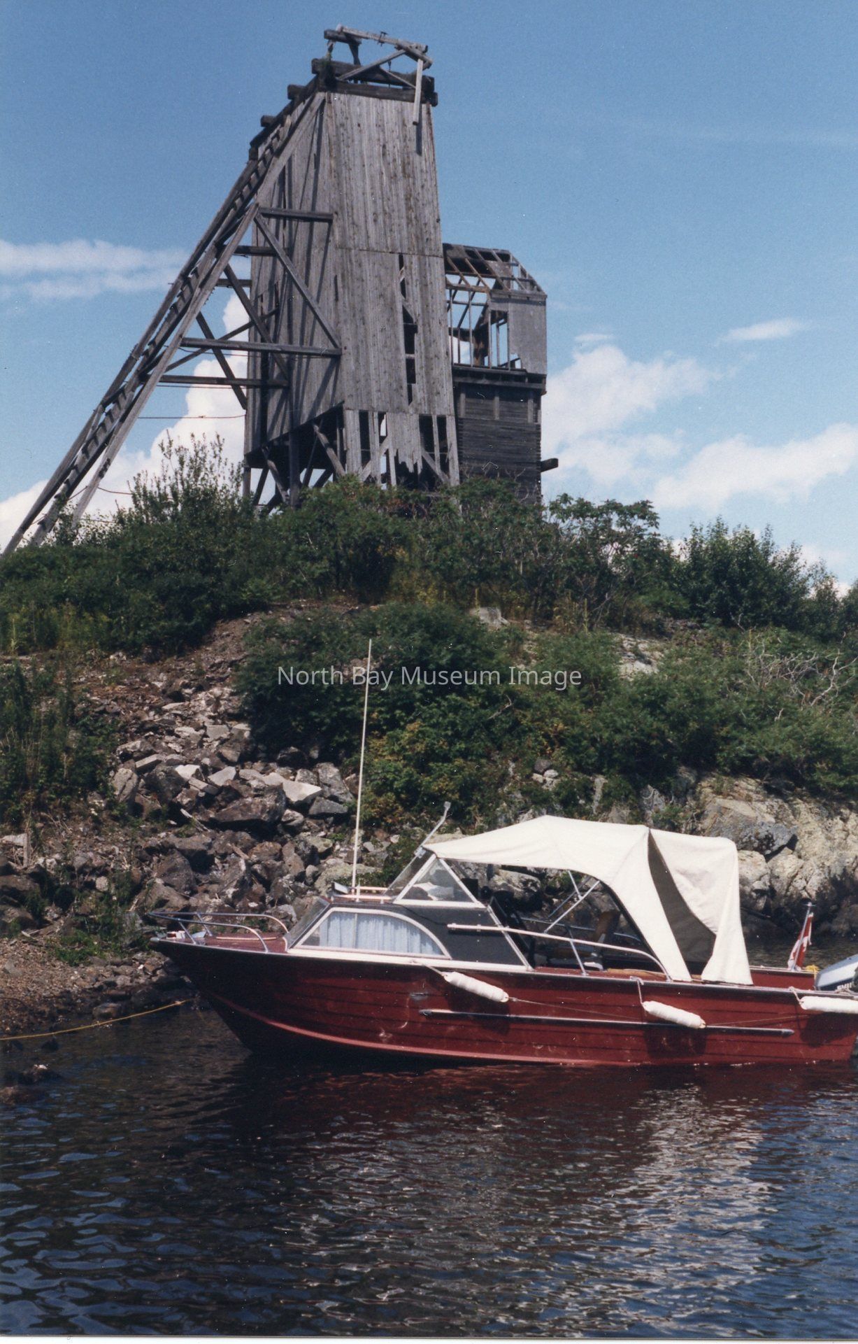 -Photograph. -Colour. -4 x 6. -Mine shaft on Newman Island. -View from Lk. Nipissing (boat in foreground). -Taken 1986.