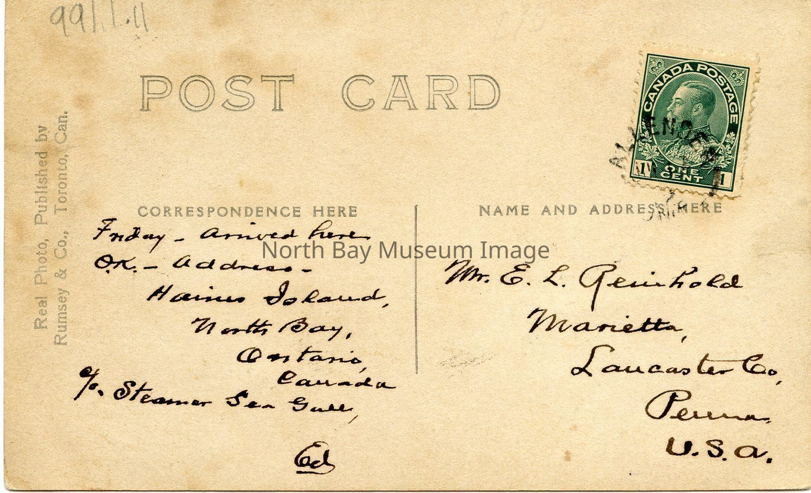 On the back of the postcard is a green 1c stamp. This postcard's address is in N.B, and the card is addressed to Mr. E.L. Genishold (?). This postcard was made in the In the U.S.A. Real photo, published by Rumsey & Co. The dimensions for this posctard is 3.5 x 5.5.
