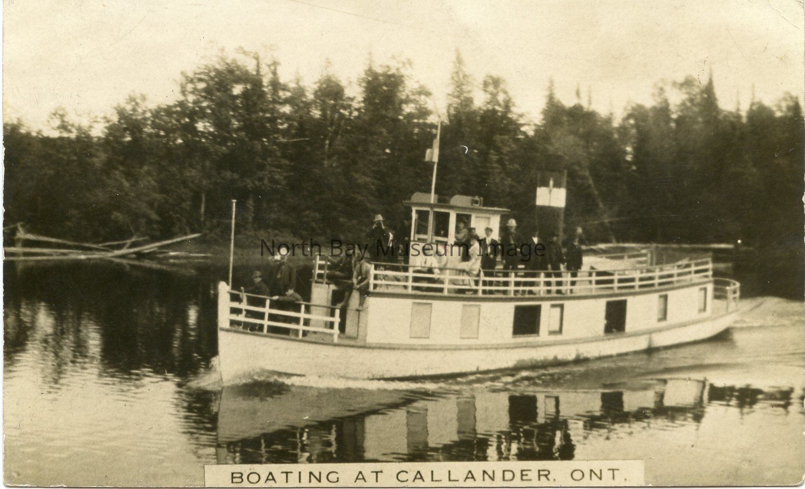 The boat It is on a river or lake. There are fir trees in the background. This posctard is entitled boating at callander, ON.