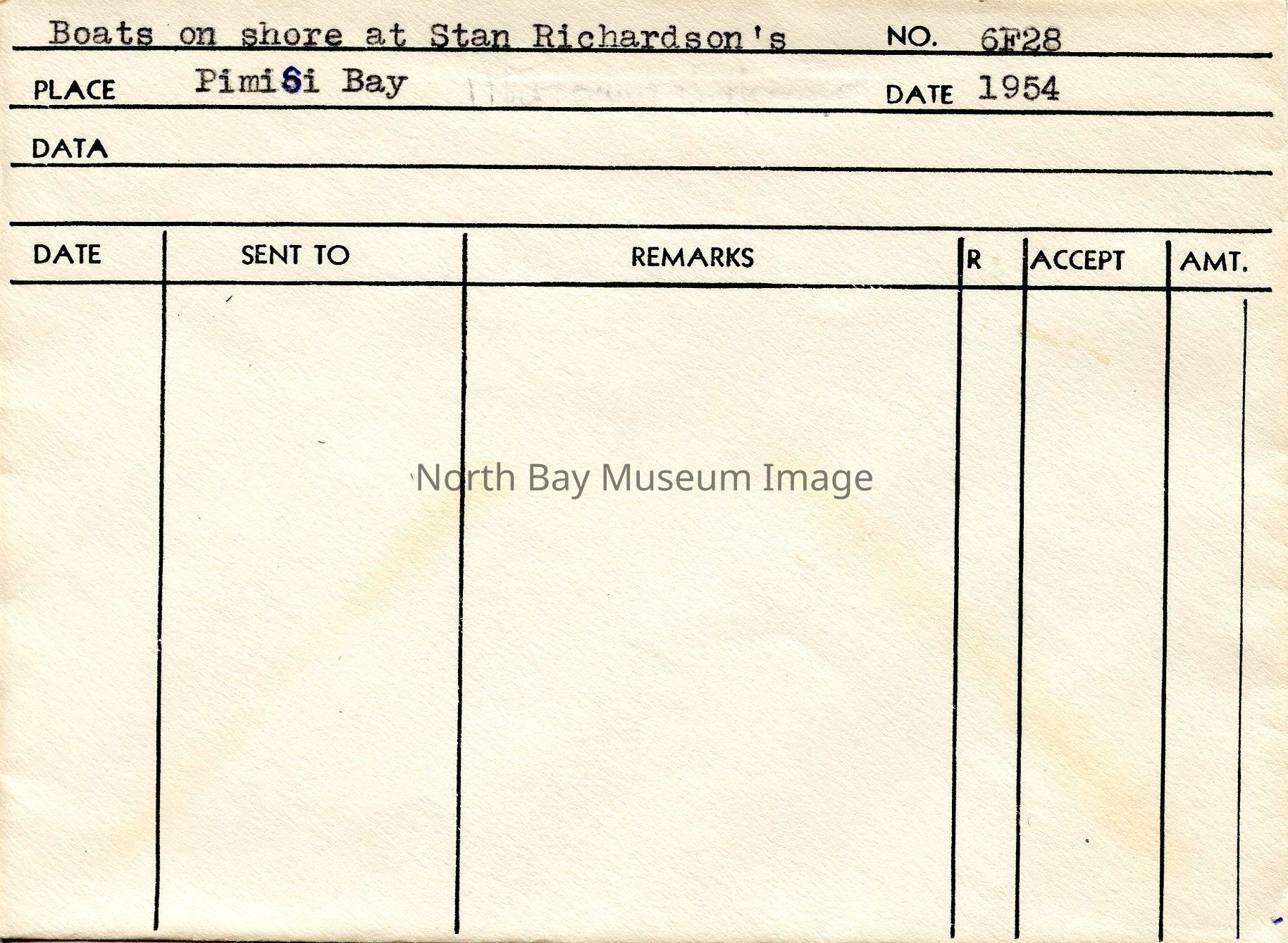Envelope (a) containing photos and negatives of boats on shore at Stan Richardson's Pimisi Bay. Forder original 6F28. Lists places published on envelope.Creator