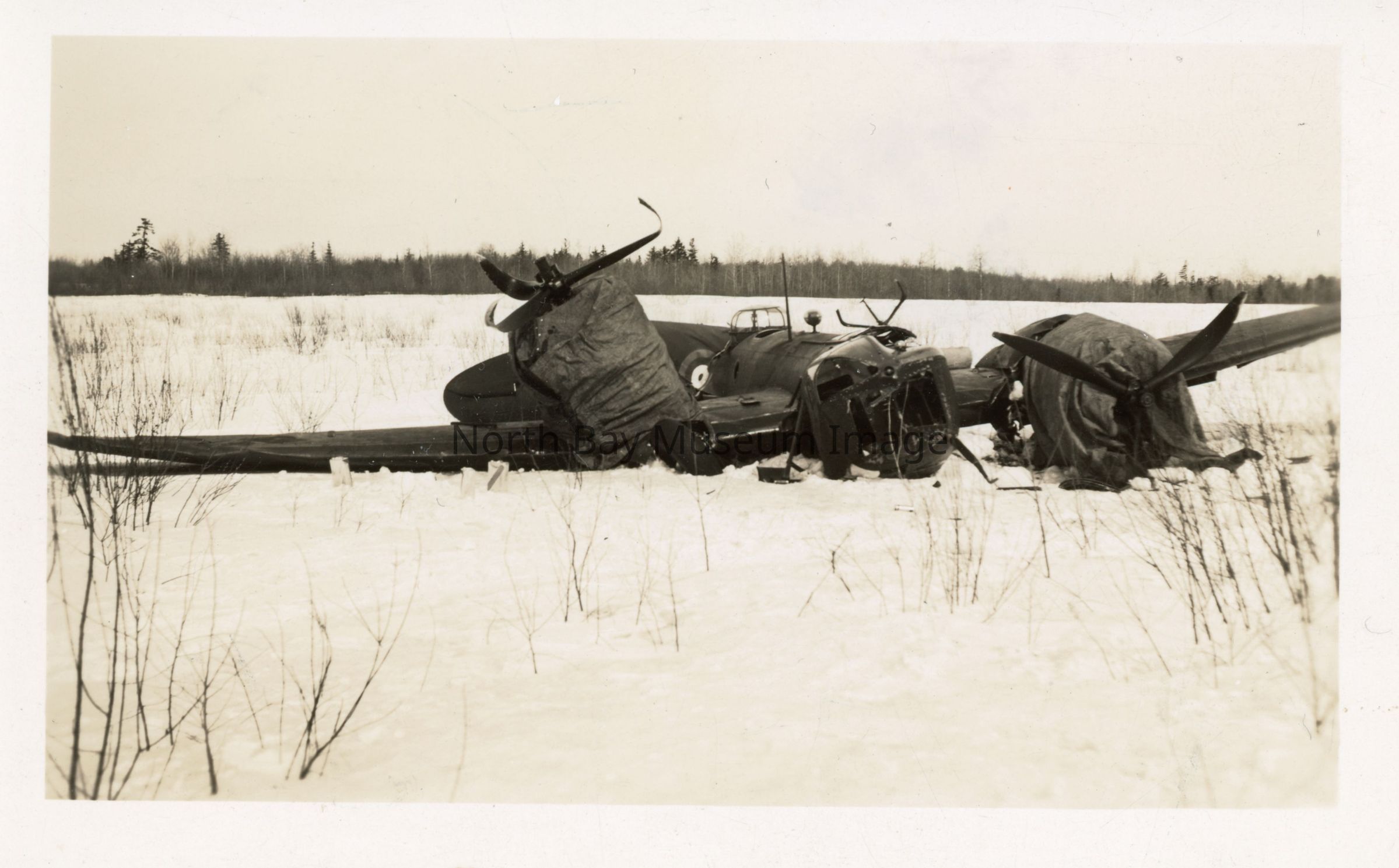 Photographs of plane crash. Bollingbroke Mk. IV s/n 9076 was being ferried by a crew from Ferry Detachment at North Bay. The detachment was part of the R.C.A.F. Station Rockcliffe-based No. 124 (Ferry) Squadron. The aircraft took off from North Bay in windy conditions on the 5th of April, 1943 and immediately experienced a starboard engine failure. The aircraft's wing dropped and the pilot was unable to recover it. The Bollingbroke struck the ground in a steepening turn at 16:07 hours. Neither crew member was injured. The aircraft sustained Category 'A' damage and subsequently written off. The crew included Pilot - Pilot Officer S. L. Everett. And Crewman - LAC W. E. Corbett. (a-b) show the wreckage from two different angles: one close up and one farther back. Note that there is snow on the ground.Creator