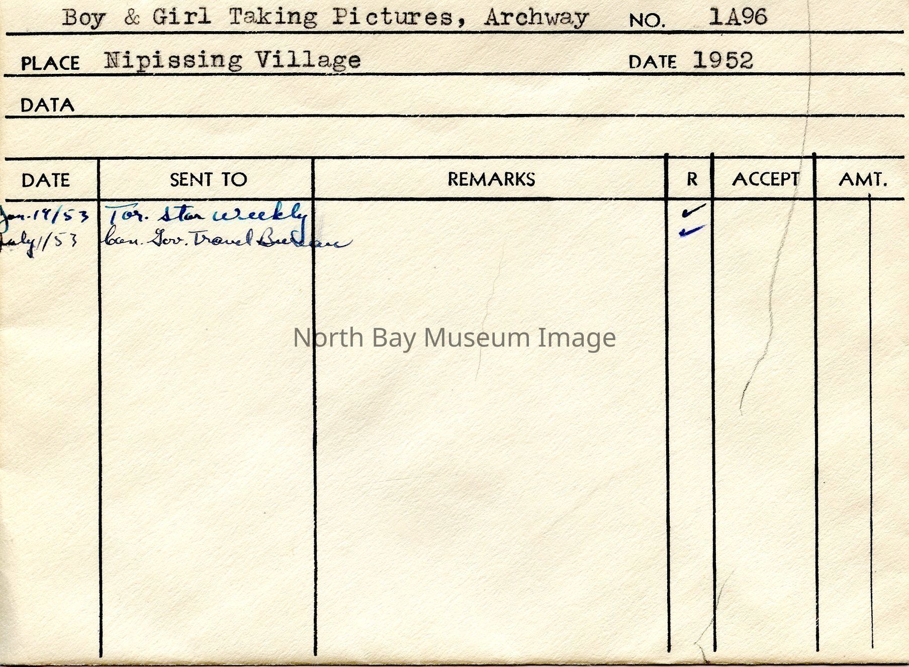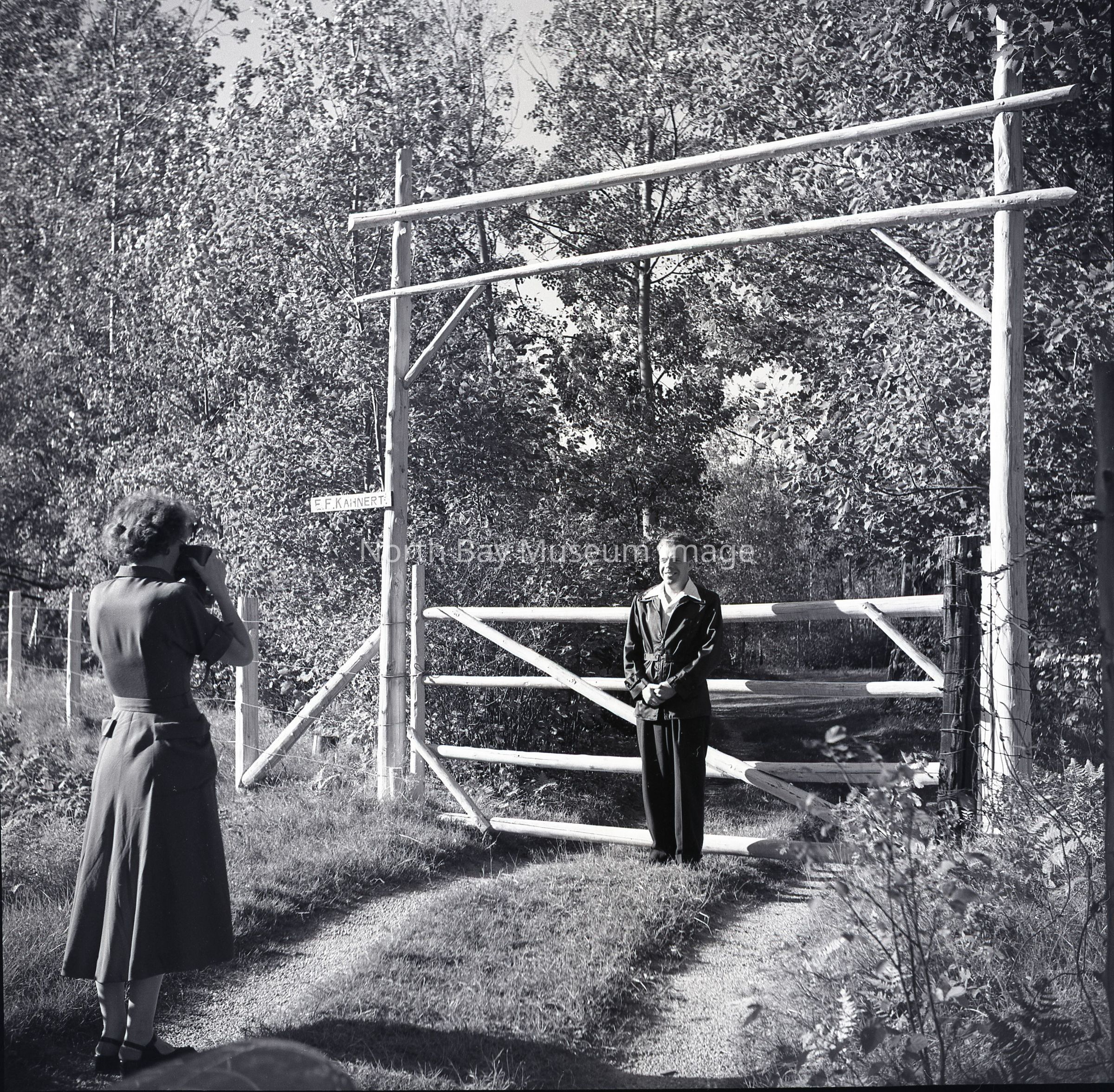 Photographer's Envelope (a) contains photographs and negatives (b-c) of a man and woman taking pictures under an archway located in Nipissing Village. The man is posing while the woman is snapping his picture in front of a wooden archway. Publications of the photo are listed on the back of the envelope.This image is a part of the Forder Collection.Creator