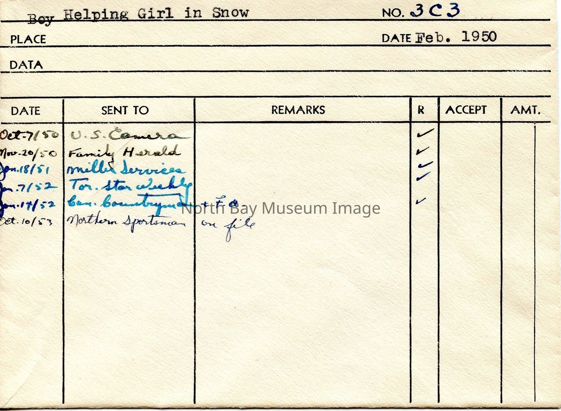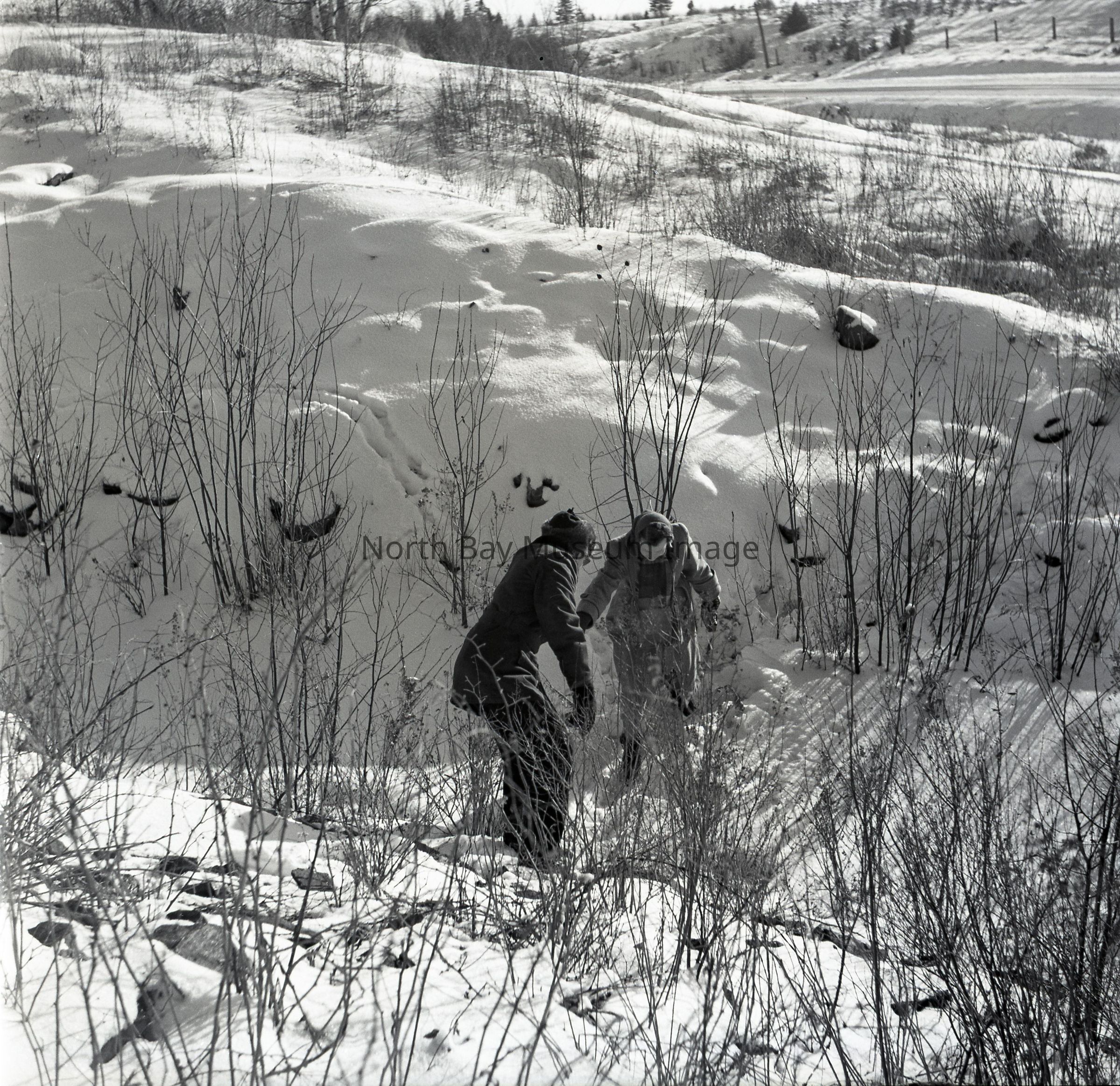 Original photographer's envelope (a) containing negative (b) of a booy helping a girl in the snow. The image is of a boy assisting a girl in what looks to be climbing through the snow up a ridge. A part of the Forder Collection. The photographers original number is 3c3. All of the photographs publications are listed on the the envelope.Creator