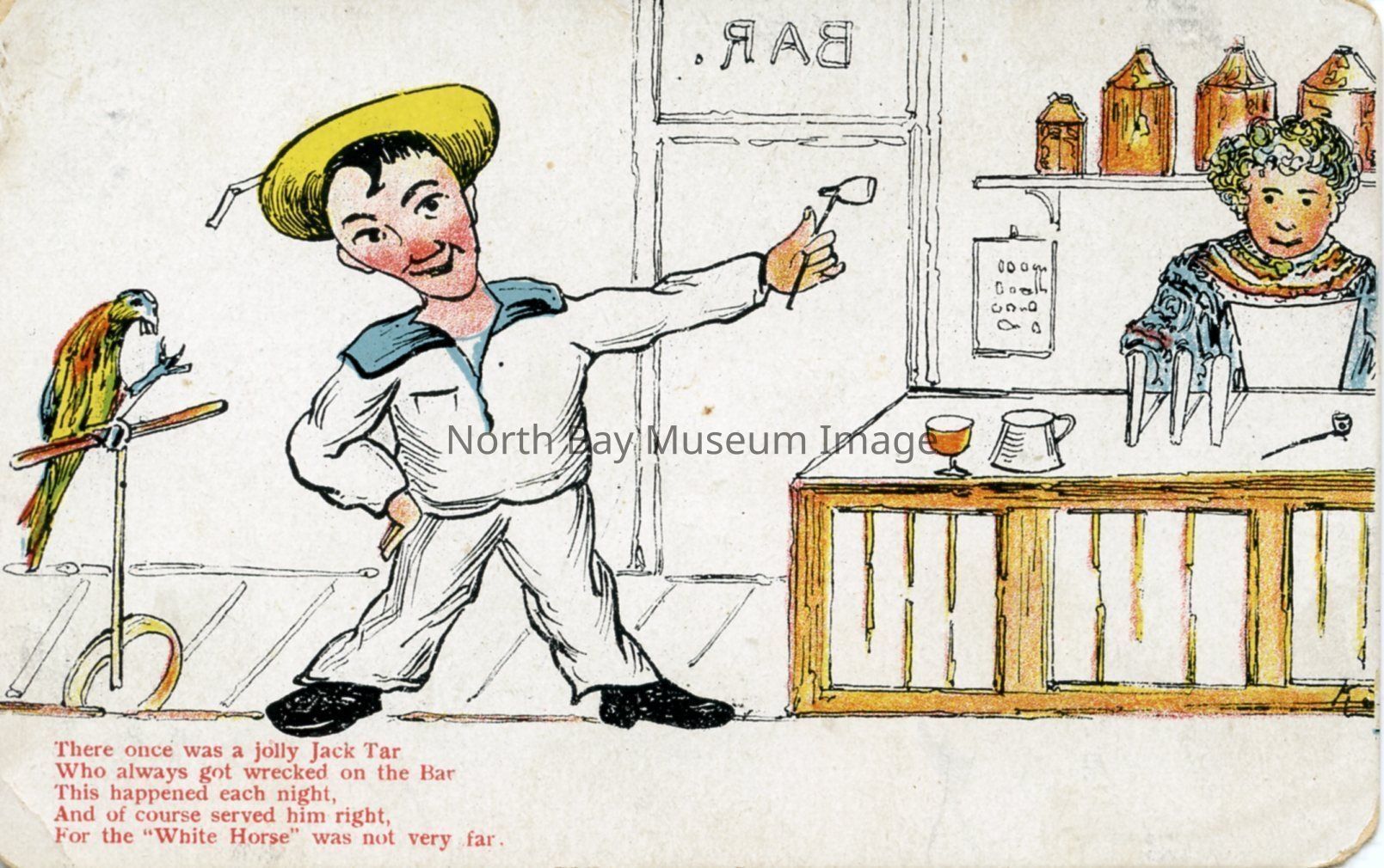 This is a coloured postcard. The postcard is white with little colourful illustrations. There is a small boy in a white outfit, a shop keeper, and a parrot. There is a little poem on the right hand side of the postcard that says "There once was a jolly Jack Tar."