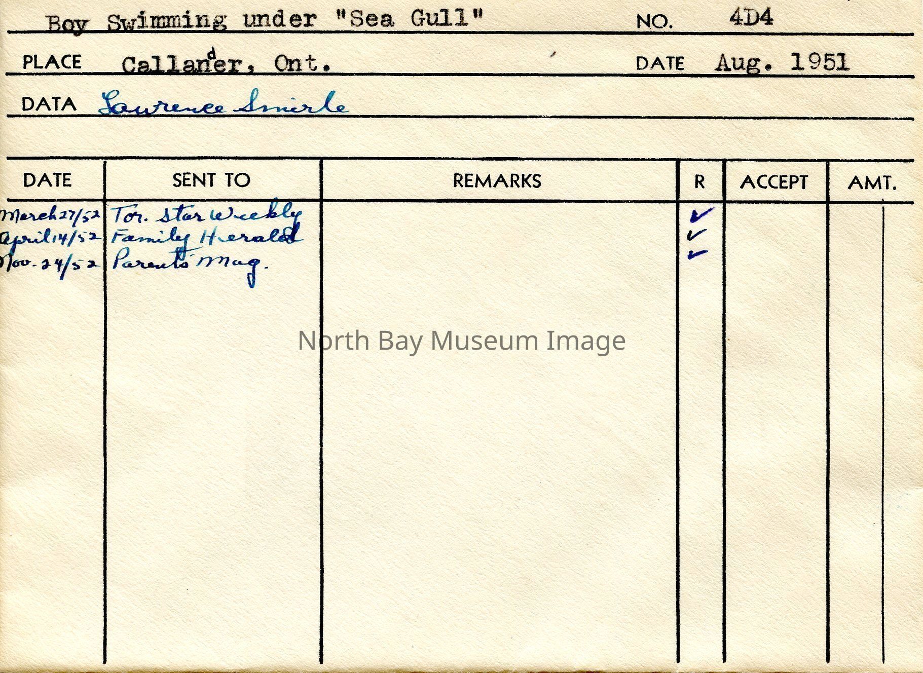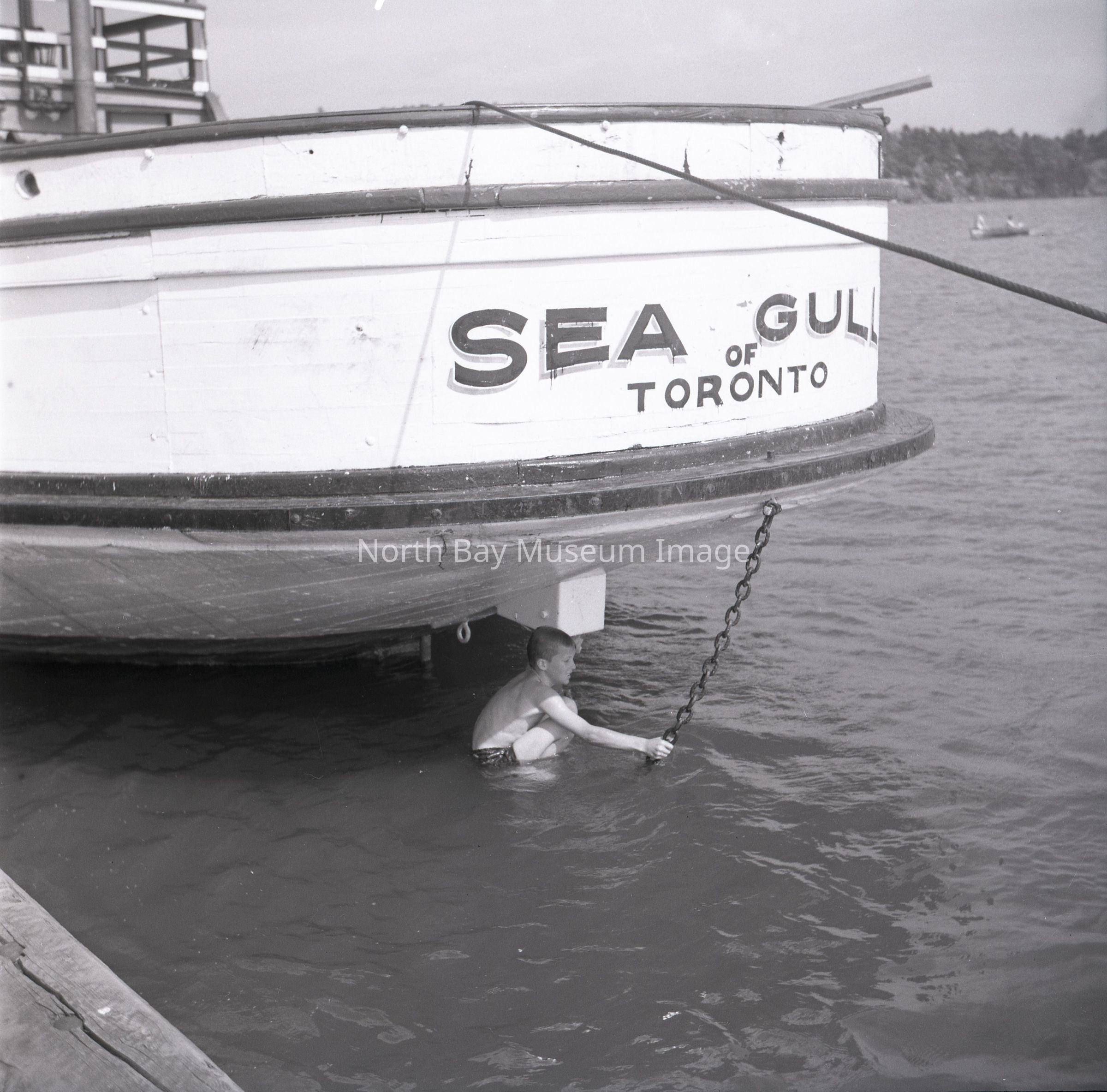 Original Envelope (a) containing negative (b) and photograph (c) of a boy swimming under the "Sea Gull." The image is of a young boy sitting in the water , he has his hand on a cain holding up a boat called the Sea Gull of Toronto. A part of the Forder Collection. The photographers orignal accession number was 4D4. All of the publications of the photo are listed on the envelope.Creator