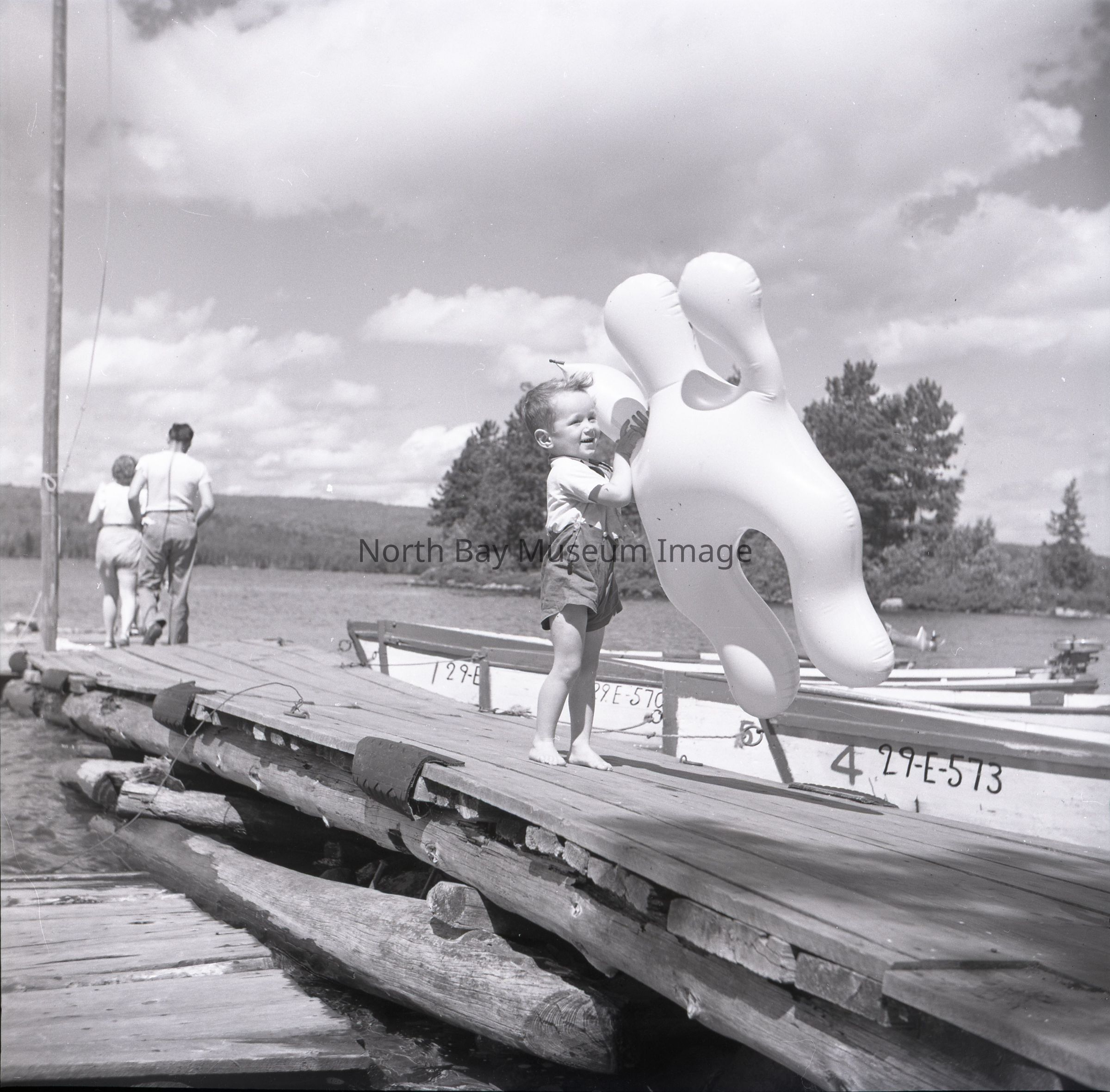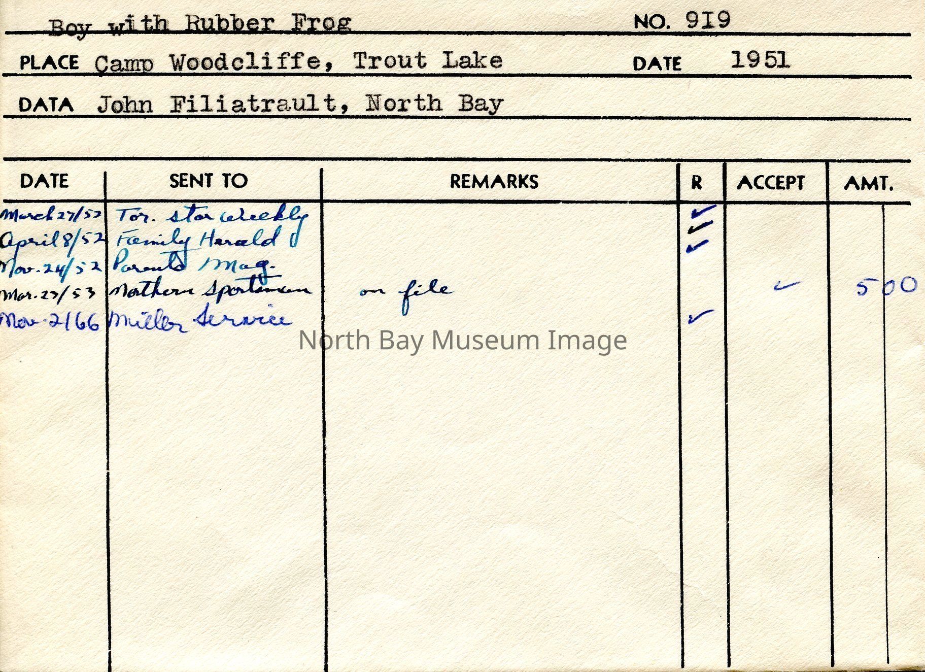 Photographer's Envelope (a) contains photographs and negatives (b-c) of a littlw boy with a rubber frog. The little boy appears to be standing on some type of dock with his rubber frog which also looks to be a pool floaty. The envelope states that this image was taken at Camp Woodcliffe at Trout lake. The envelope also provides the name of John Filiatrault which may be the name of the boy in the photo. The Publications of the photo are listed on the back of the envelope.This image is a part of the Forder Collection.Creator