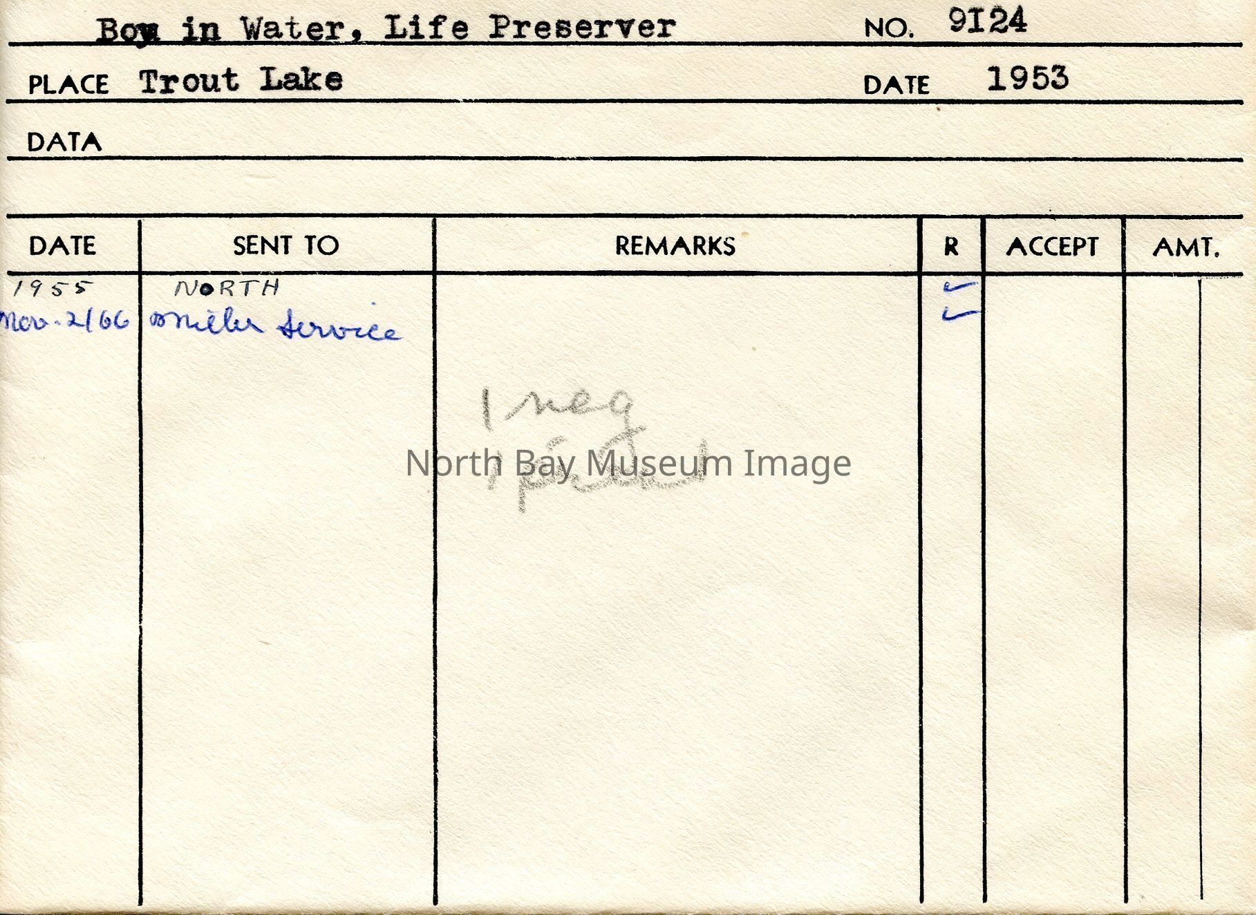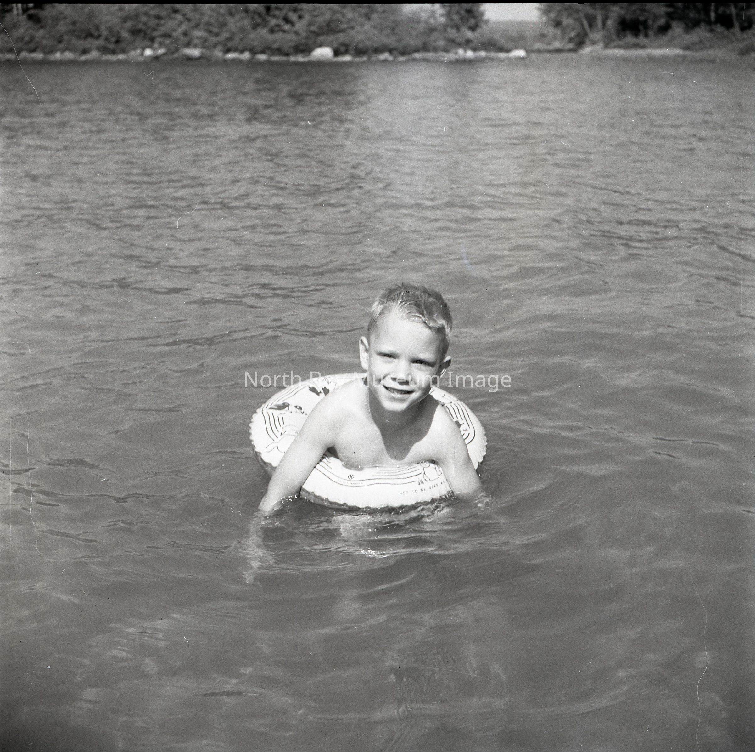 Photographer's Envelope (a) contains photographs and negatives (b-c) of a boy in the water at Trout Lake. The boy is wearing a life preserver. The Publications of the photo are listed on the back of the envelope.This image is a part of the Forder Collection.Creator