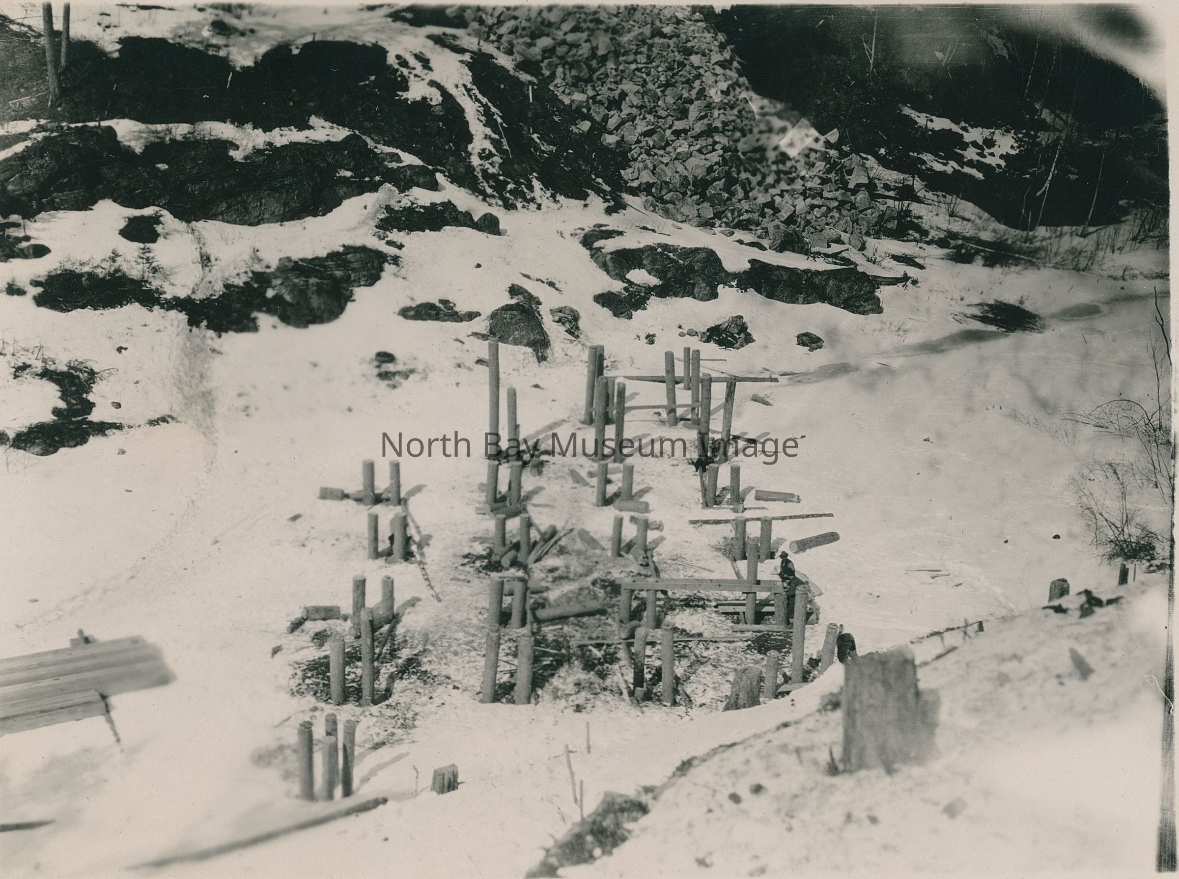 Print, Photographic - black and white photograph - shows a partly-completed bridge for rail tracks - landscape indicates it is winter