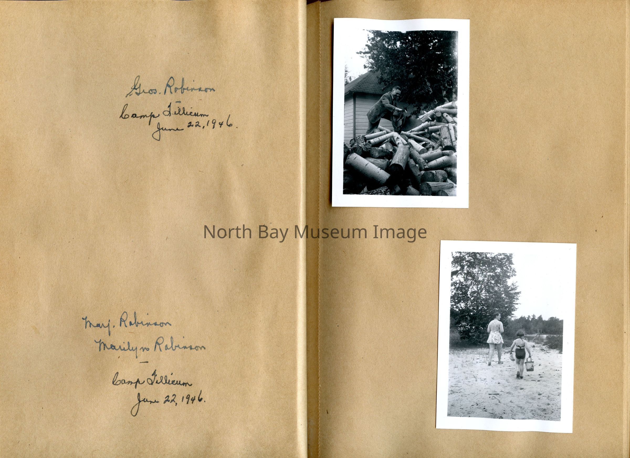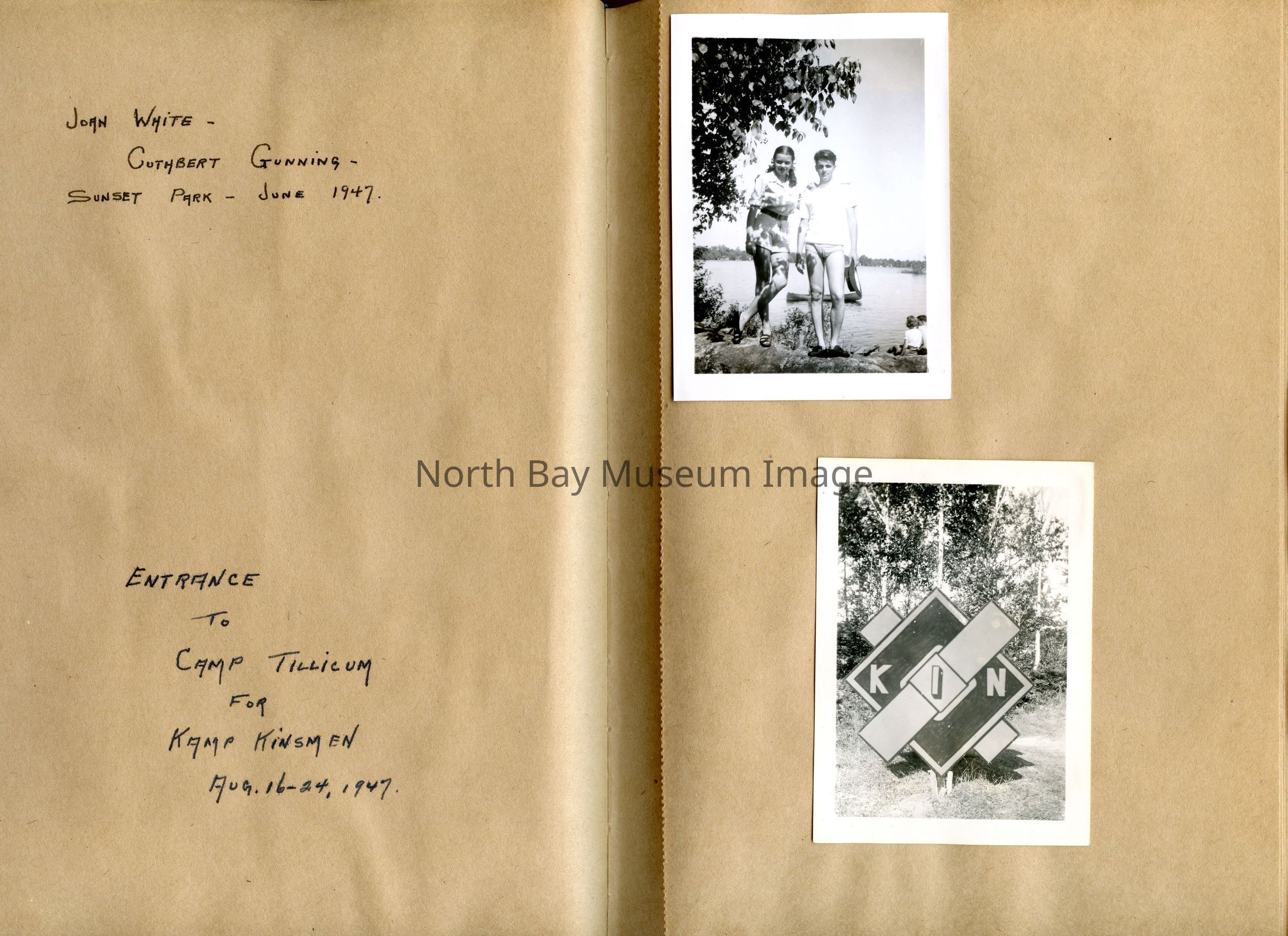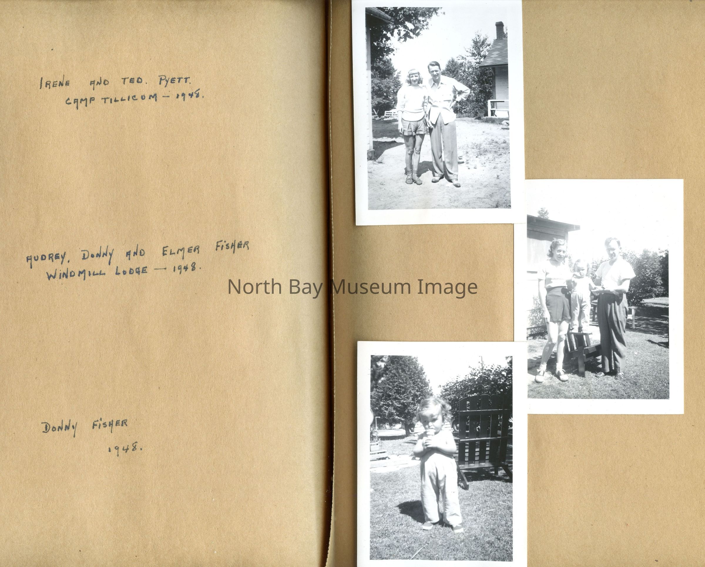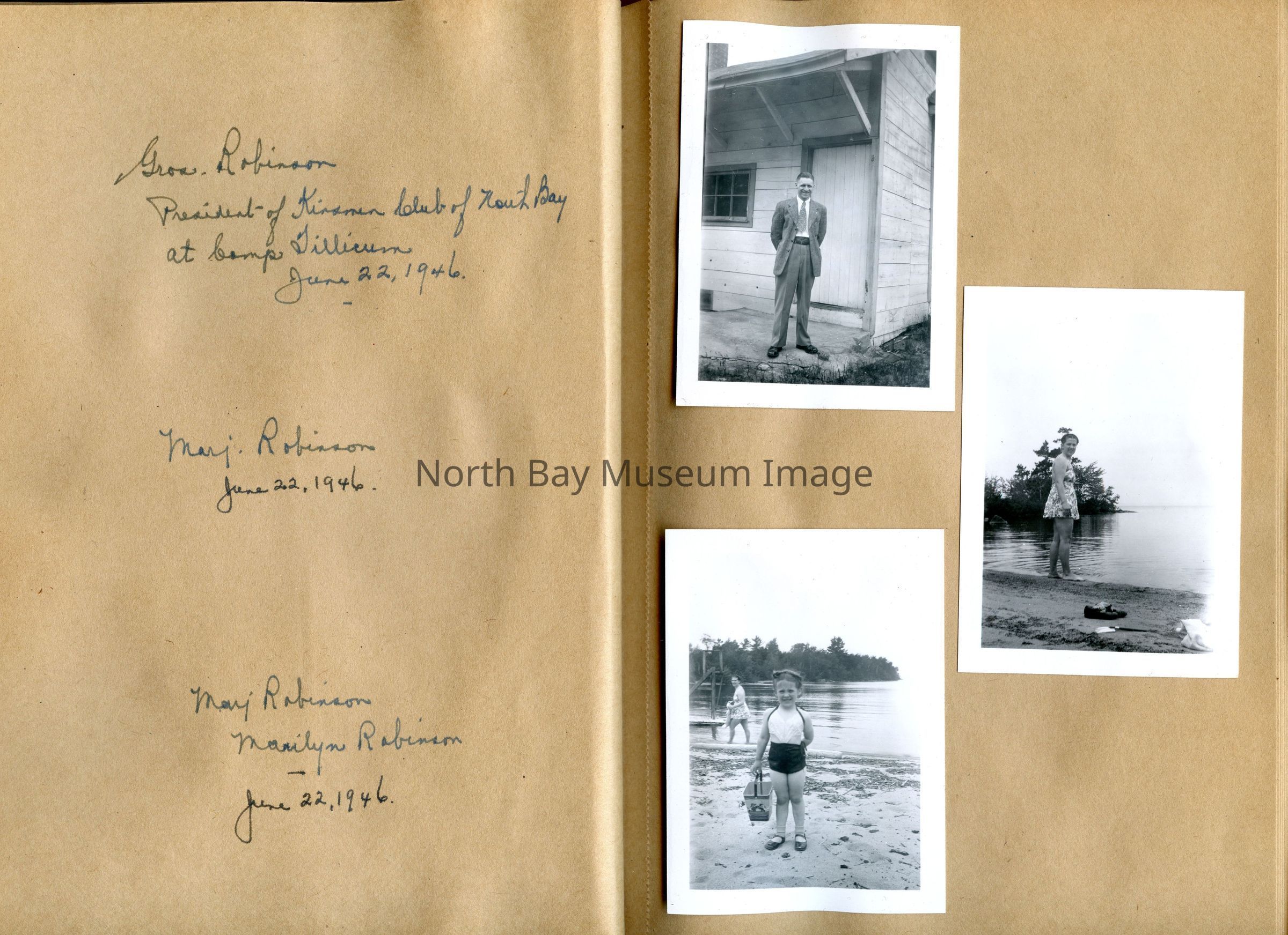 Includes photos of Camp Tillicum and Kamp Kinsmen, Dorothy Hicks, Marion York, Mr. and Mrs Robinson, Mr and Mrs Fisher, Mrs Howard, Julies Bergman, Harold Harobin, Doris and John Smorithwaite, Jack Barnaby, Jack Huntington, Robinson family, Windmill lodge, York family, paul and pauline vezina, wallace newman, ted pyett, Caswell family, and more.