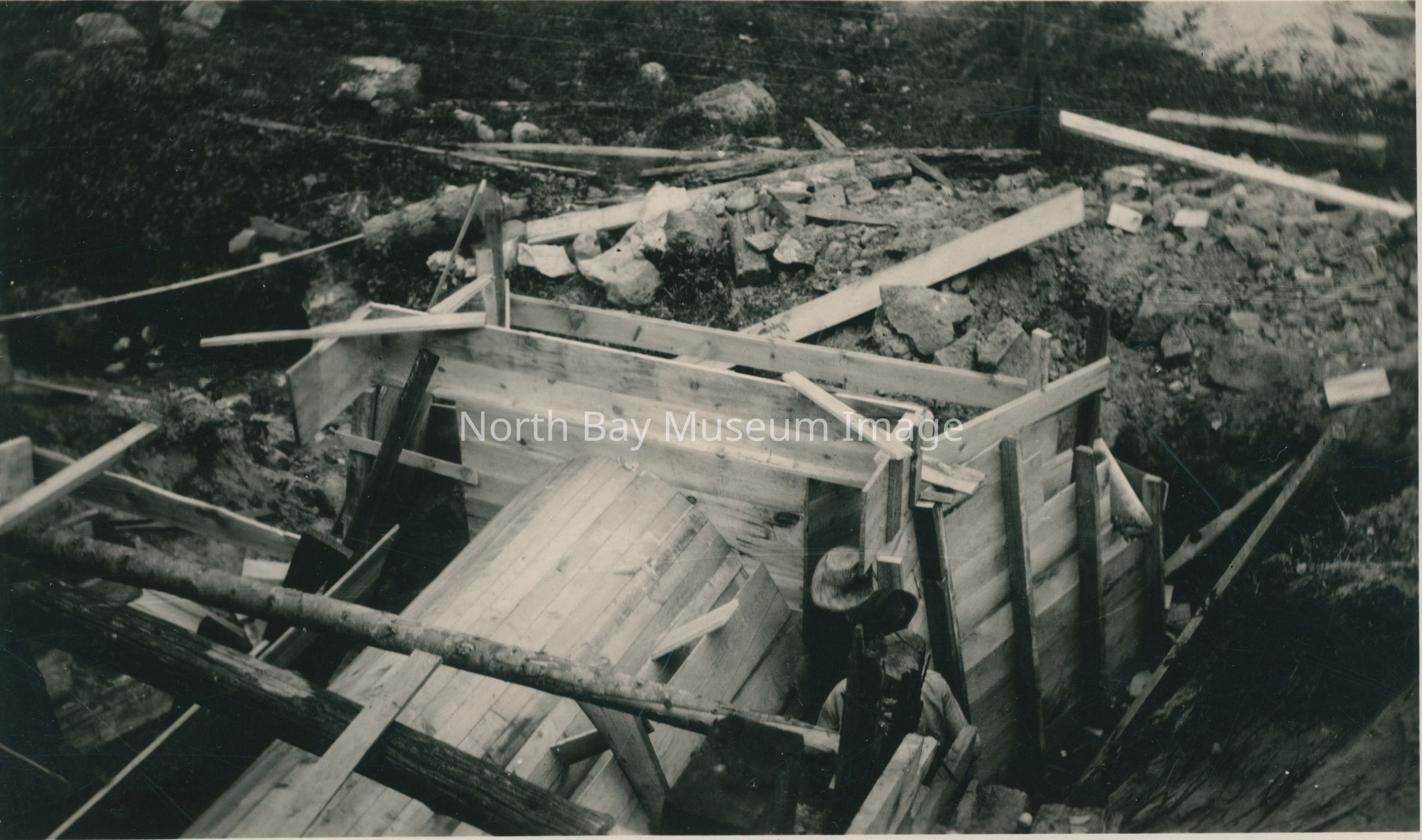 Print, Photographic - black and white photograph - wooden structure built against stone rubble - half box shape attached to cylinder