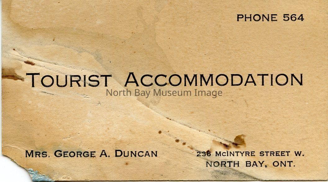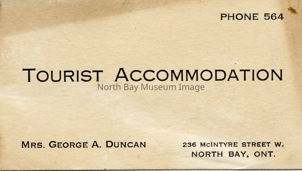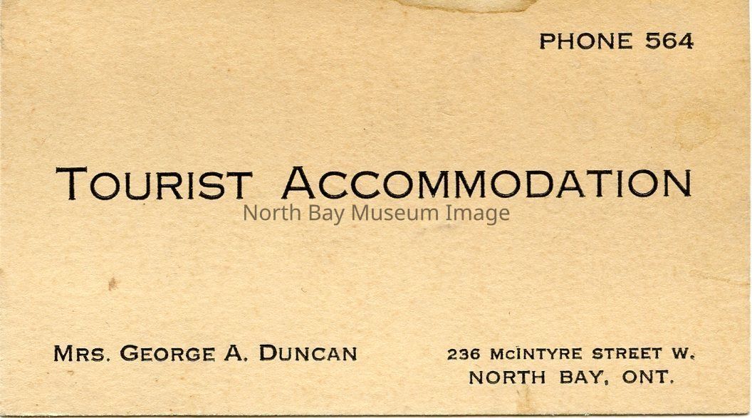 These buisness cards are on off white paper. These cards are tourist accomodations Business cards. The person listed on the card is Mrs George A Duncan. They are located at 236 McIntyre Street West North Bay.