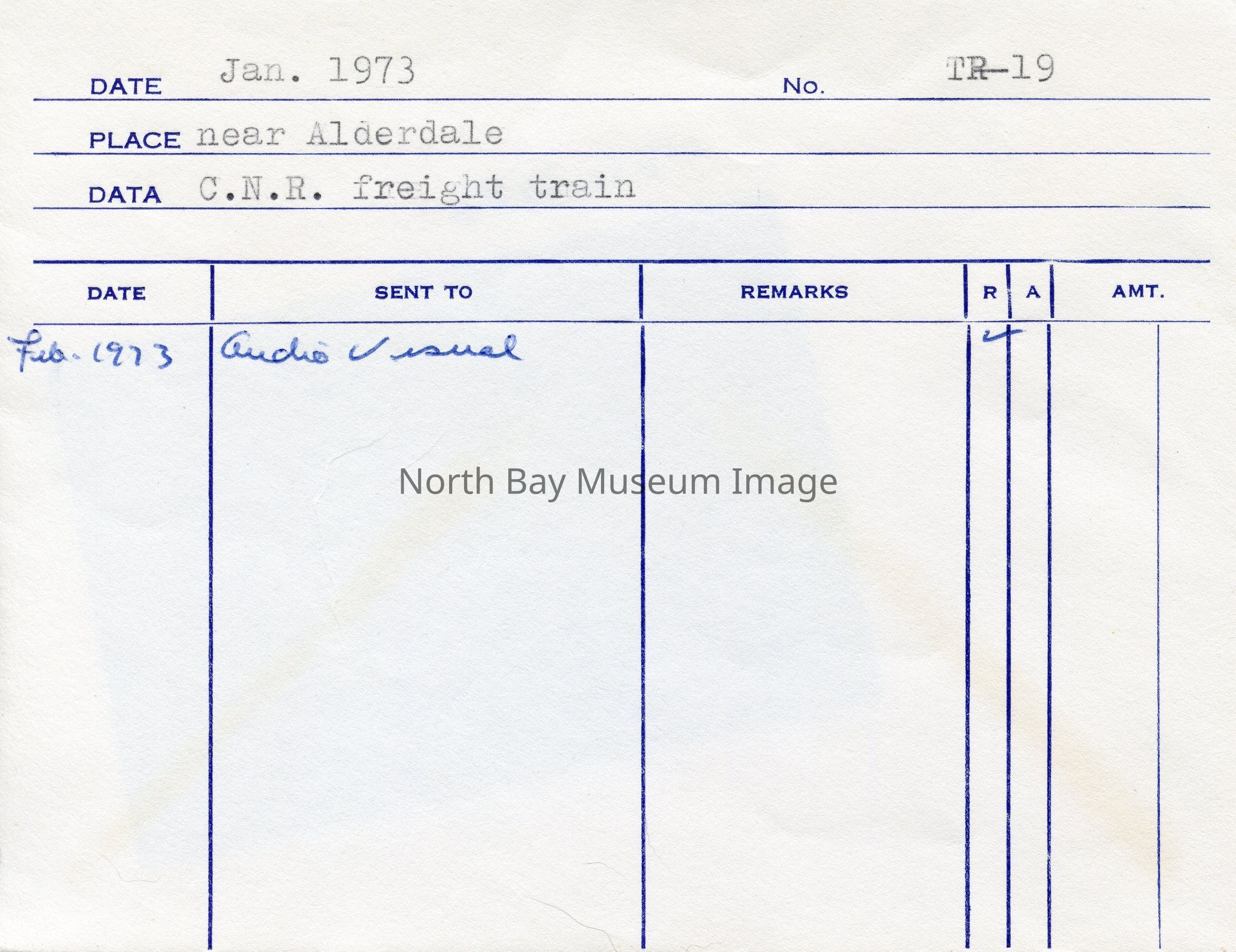 Inscriptions: "Jan. 1973", "No. TR-19", "near Alderdale", "C.N.R. freight train". Forder put the item(s) in this envelope, so contents have original order.