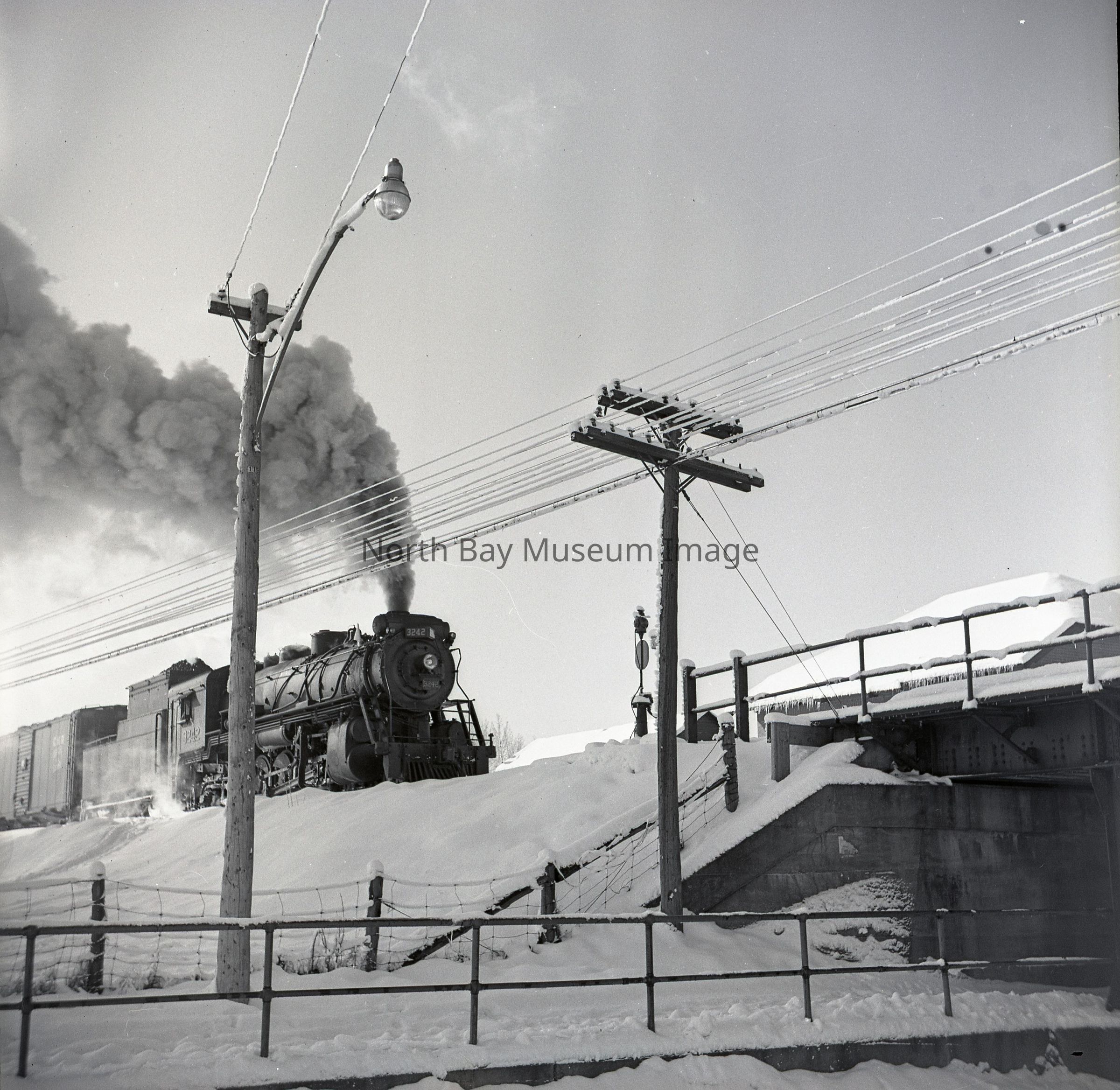 019.60.397b- Black and white negative, steam engine at Cassell's Street Bridge, North Bay.Creator