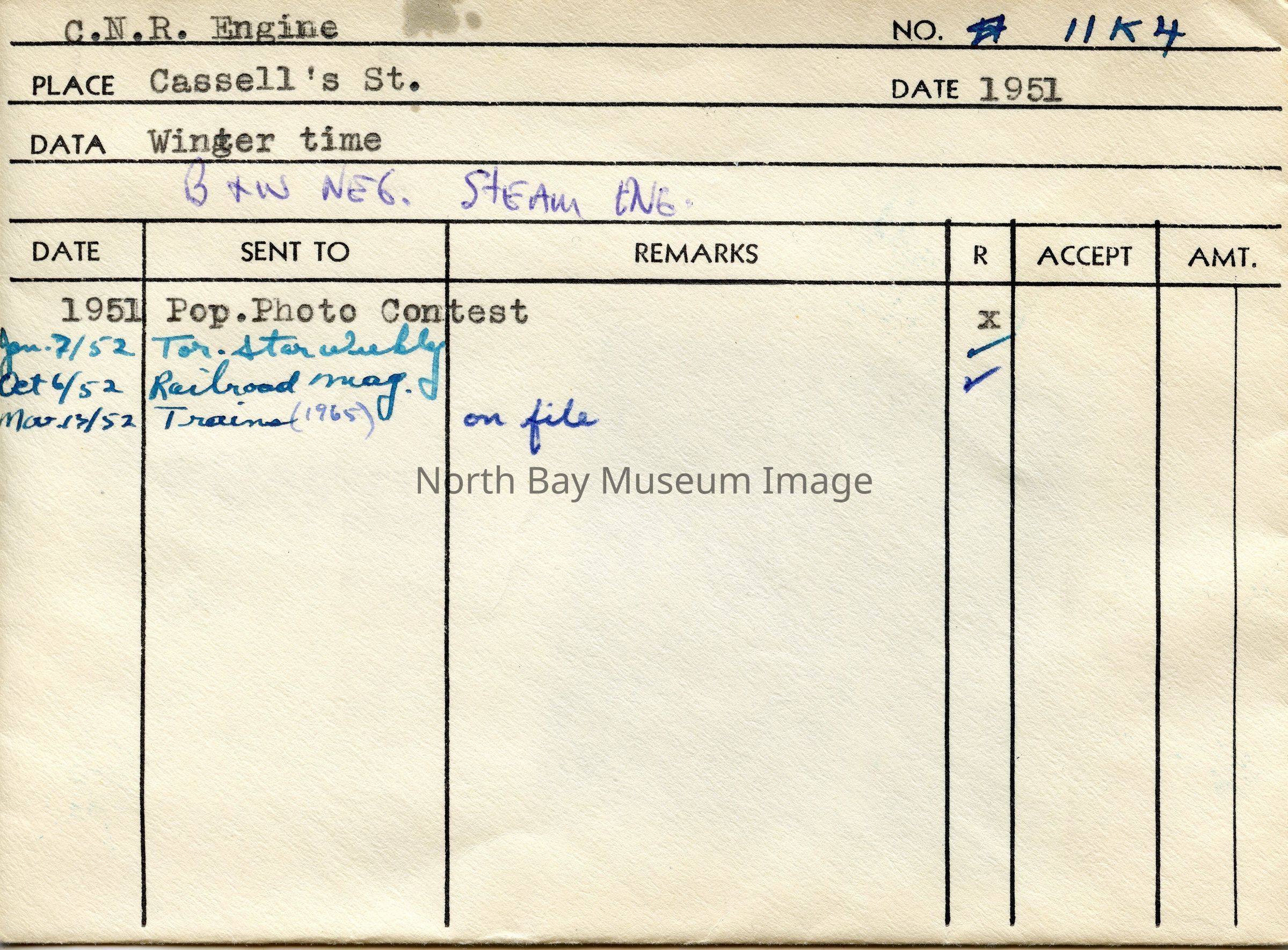 019.60.397a - Envelope. Inscriptions: "C.N.R. Engine", "11K4", "Cassell's St.", "1951", "Winter time".