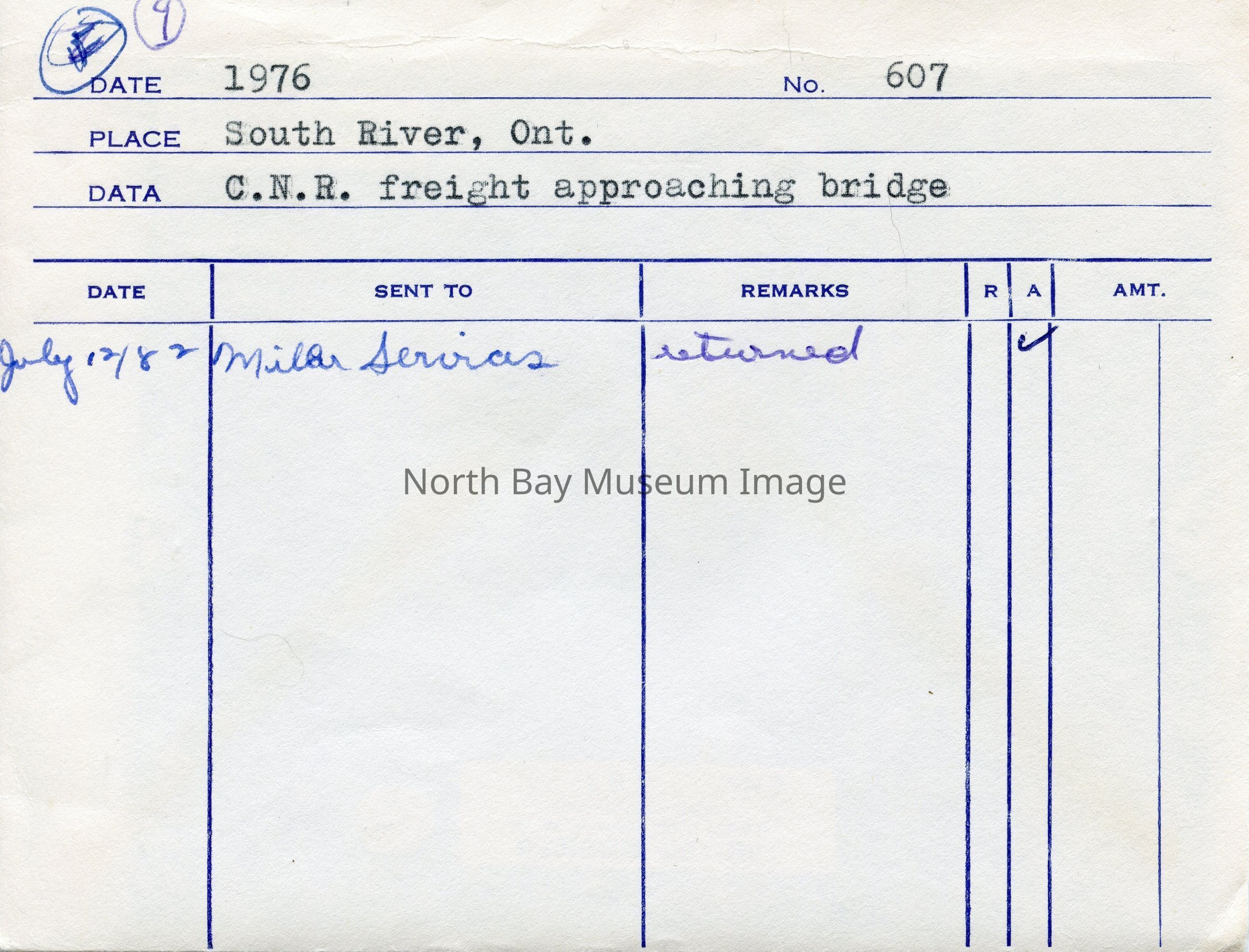 Inscriptions: "1976", "No. 607", "South River, Ont.", "CNR freight approaching bridge." Forder put the item(s) in this envelope, so contents have original order.