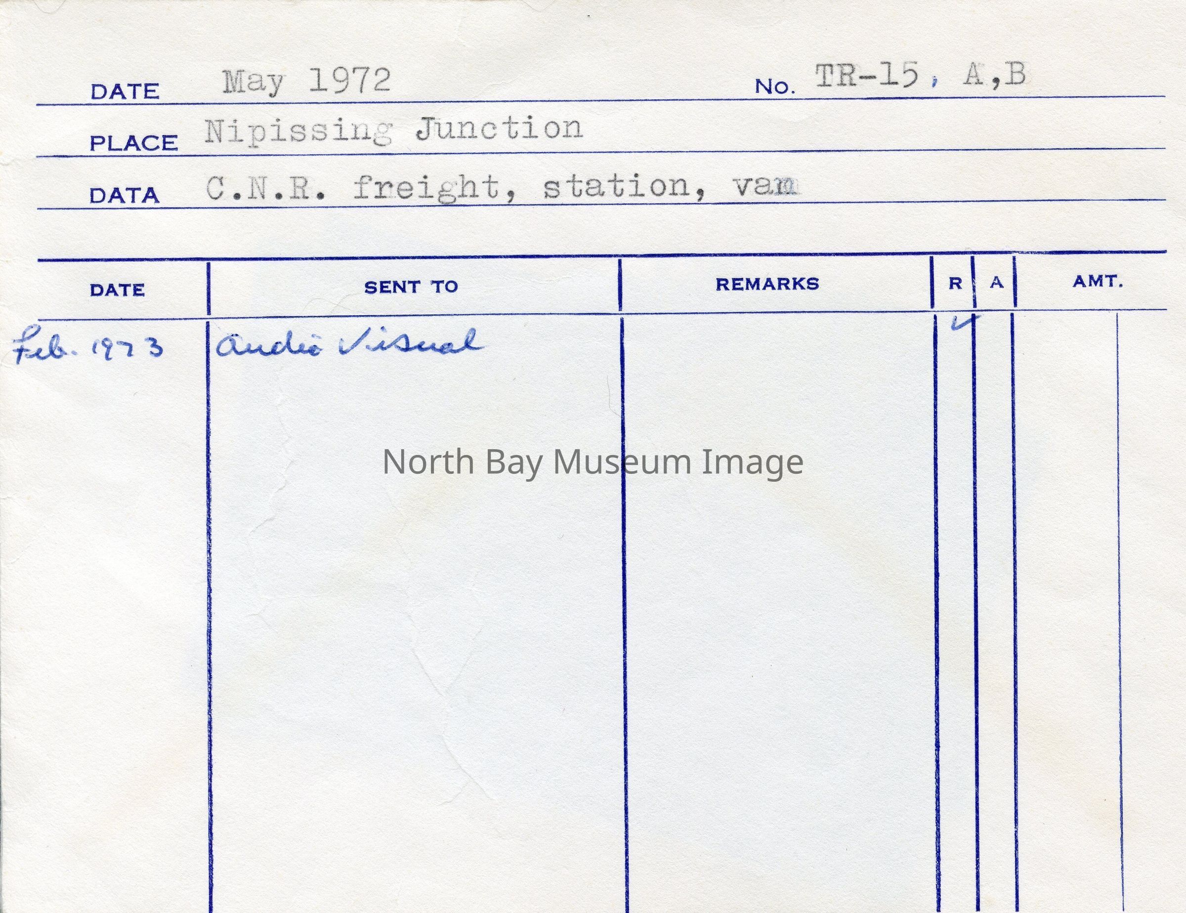 Inscriptions on envelope: "May 1972", "TR-15, A, B", "' Nipissing Junction", " C.N.R. freight, station, van". Forder put the item(s) in this envelope, so contents have original order.