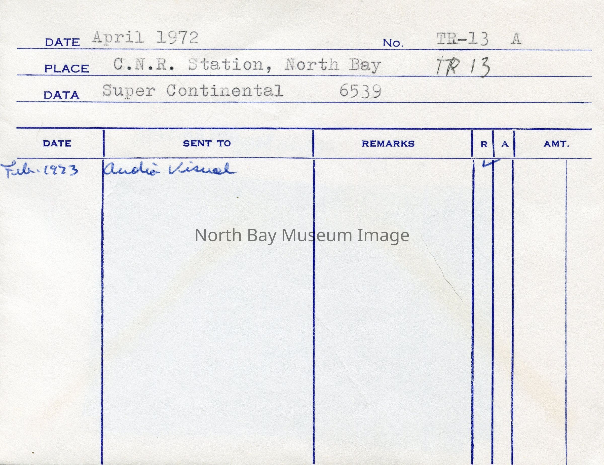 Inscriptions: "April 1972", "TR-13 A", "C.N.R. Station, North Bay TR-13", "Super Continental", "6539". Forder put the item(s) in this envelope, so contents have original order.